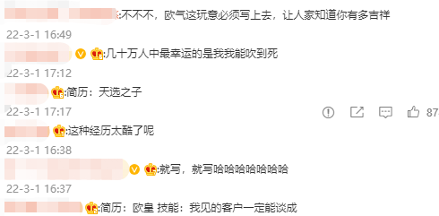 还有这一位网友很认真地问,这段经历是否可以写进自己的简历。显然没有招聘官喜欢一个只会躺平的员工,所以小编“不是很建议写”。而对于那些有“卷”倾向的应聘者,小编及时打消了他的想法,乖,好好躺平。当然还有思路清奇的网友分析了可取之处。毕竟在某品牌活动都能够现场道士作法的今天,有谁会拒绝一位自带“欧气”的打工人呢?当然也有网友保持着人间清醒,分析了获得这条锦鲤的概率比考公都低。这并没有浇灭网友们的热情,反而因为挑战难度提升更兴奋了。该微博发布于3月1日,进入了“金三银四”跳槽季的大门,无论有没有跳槽打算的人,都会留意一下招聘的行情。魔方严选正是借势这一热点,成功收拢了网友的注意力。