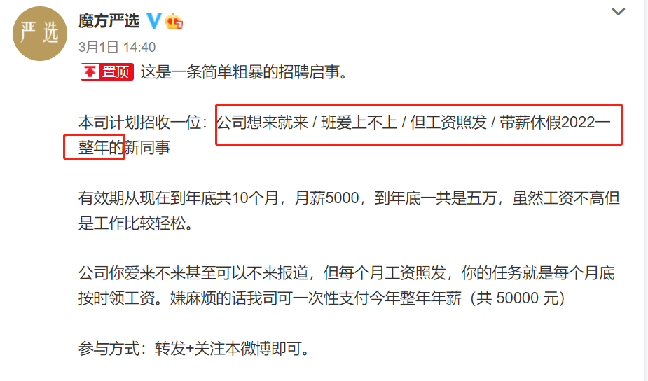 只干十个月太可惜了,还有人为剩下那俩月发愁。官方不得不下水安慰,承认自己疏忽了。话说,别看这份工作如此美好,应聘条件相当简单,关注官微+转发,就有机会获得。大为还以为能凑个热闹,说不定能搞到一份兼职,梦想还是要有的嘛,哪知一看,转发都过200万了。