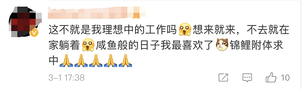 有躺薪工作已经不错了,还奢望五险一金、奖金?官方给出建议:在家呆着,不用表现。来找铁饭碗的出来了?居然有想要好好表现,干到退休的想法。官方回复:这能有啥表现空间?勉强试下,敢情还觉得委屈了,咱就不能大方的承认想要这份工作嘛。
