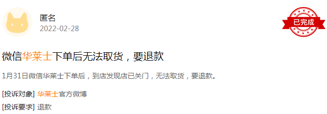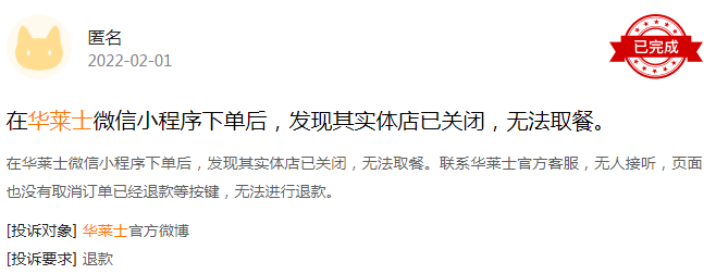 此外,还有不少关于服务体验的,比如拒绝退款,小程序下单店里取不了餐等等。总之,你能想到的各种不满意,都有可能出现在网友投诉中。