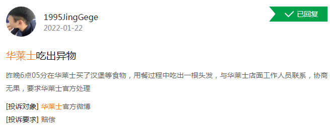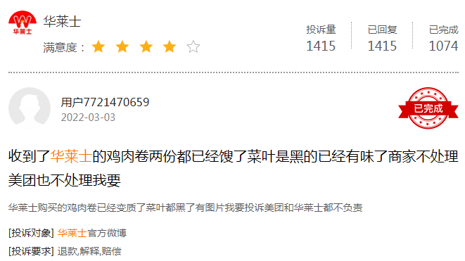 在黑猫投诉平台上,关于华莱士的投诉有1400多条。投诉的内容,大多都和商品质量有关:馊了的鸡肉卷,吃出异物,炸鸡还是生的……