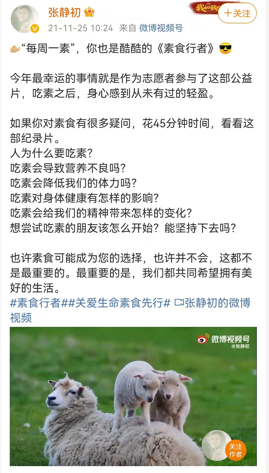 懂的都懂,明星高调推广人造肉,自己都难以下咽,又怎么有底气叫普通人信服。还有无数个关晓彤在路上,张静初也宣传过《素食行者》,张静初自己、小陶虹、邢佳栋都有出镜,一人说吃素很棒,明星八方点赞。