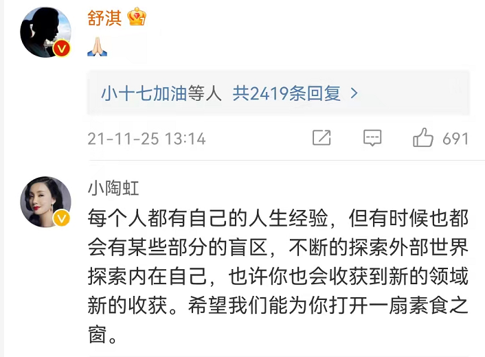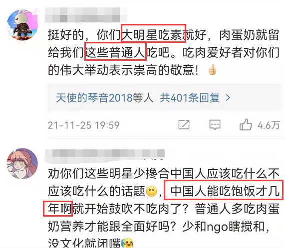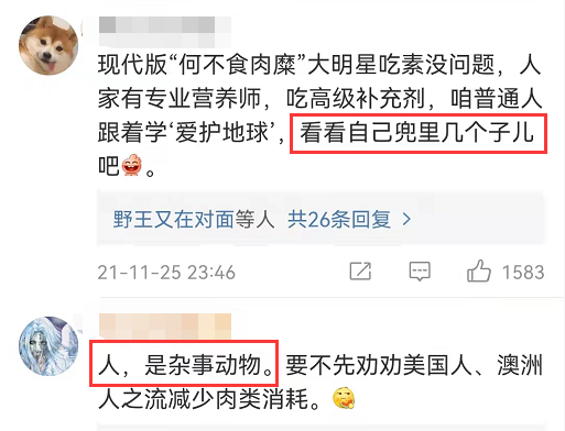 哪怕请来咖位很高的专家、明星,大家入戏都很深,但还是招来一片骂声。“明星自己吃素可以,为什么要道德绑架普通人跟着吃”而且,这些标榜吃素健康的明星,表面上一本正经地劝人吃素,背地里又是玩双标那一套,今天大鱼大肉,明天海鲜来凑。