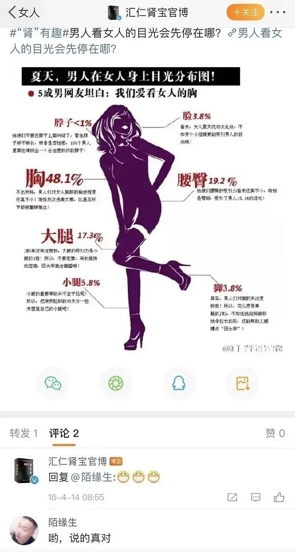 微博中汇仁肾宝做了一张“男人在女性身上目光分布图”。