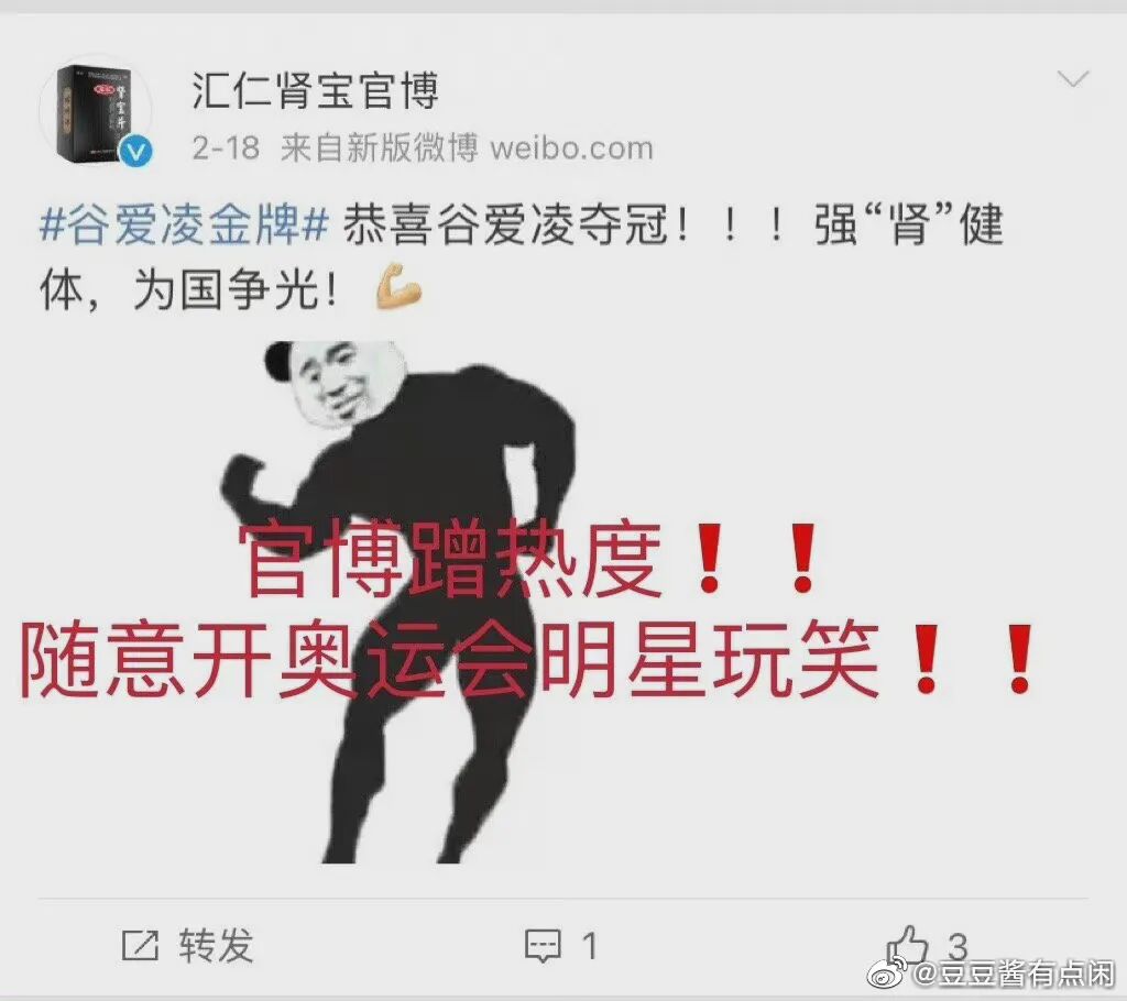 但本着顶流热点不蹭白不蹭的原则,汇仁肾宝在2月18日发了一条谷爱凌强“肾”健体,为国争光的微博。