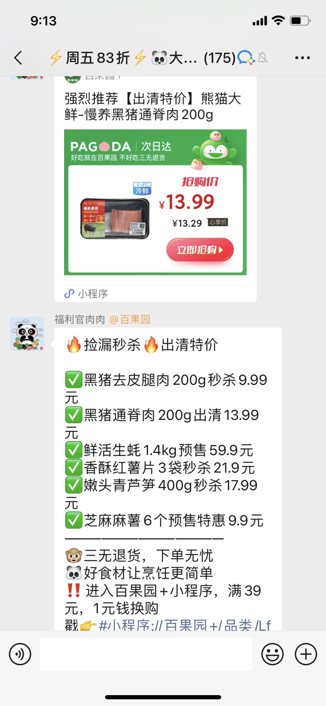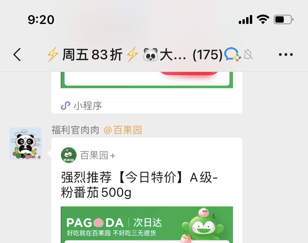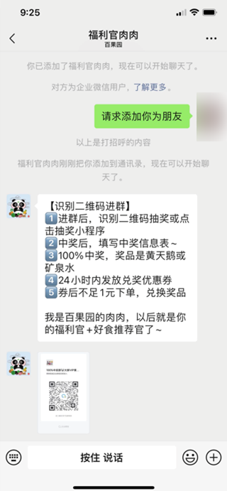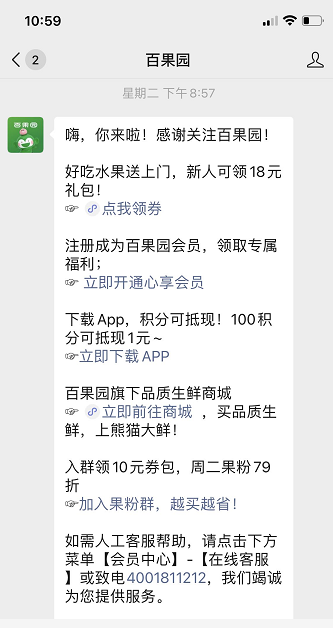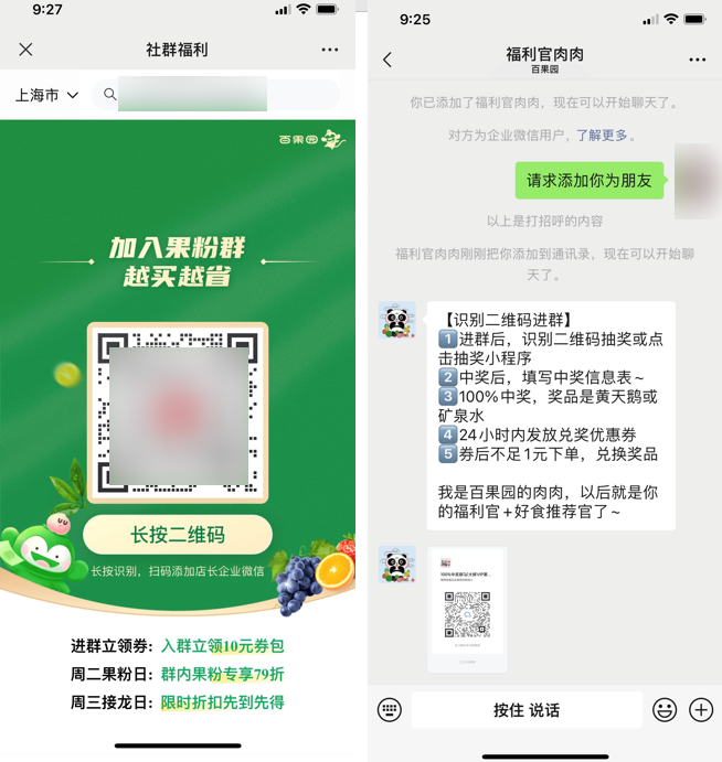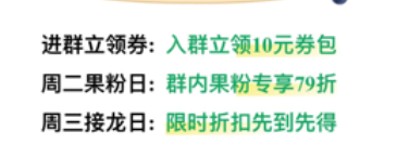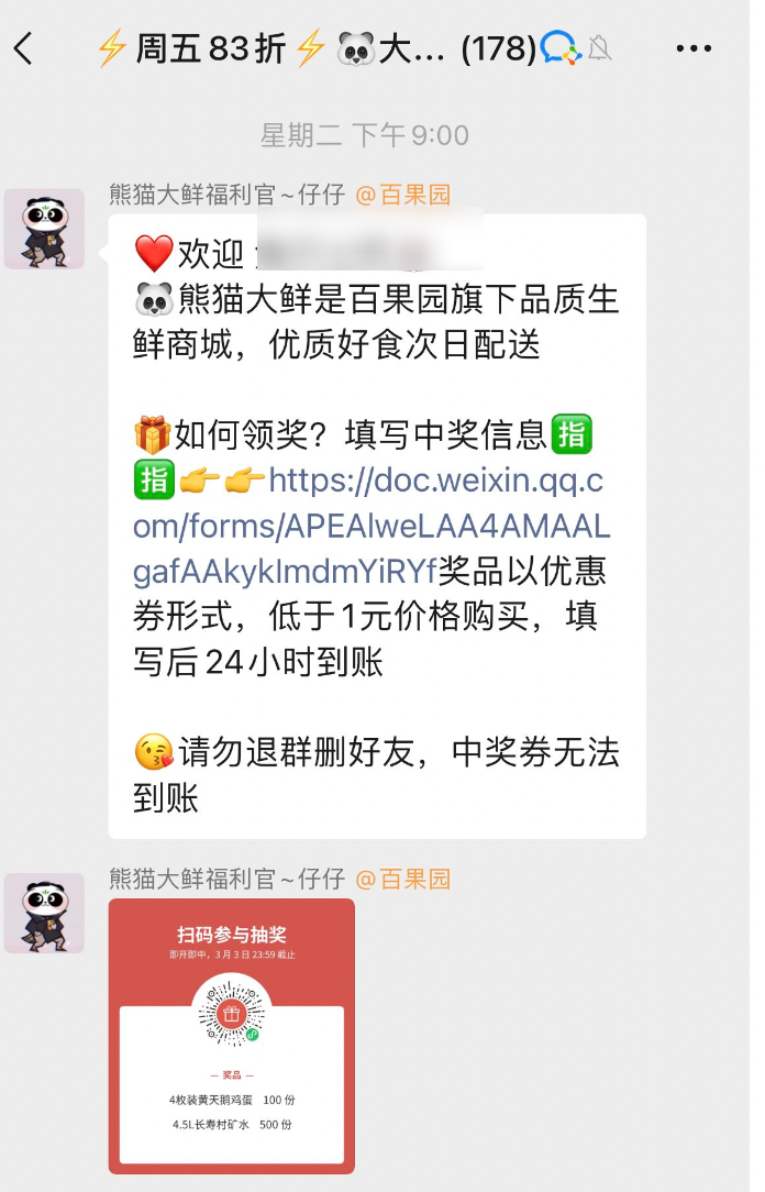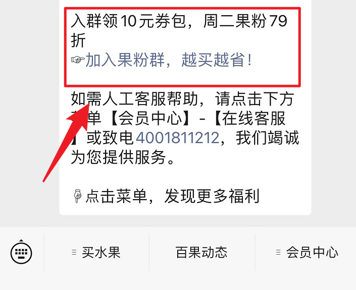 百果园向首次入群的用户发放 100% 中奖的抽奖链接,用户可以获得 1 元购买鸡蛋或桶装水的资格。