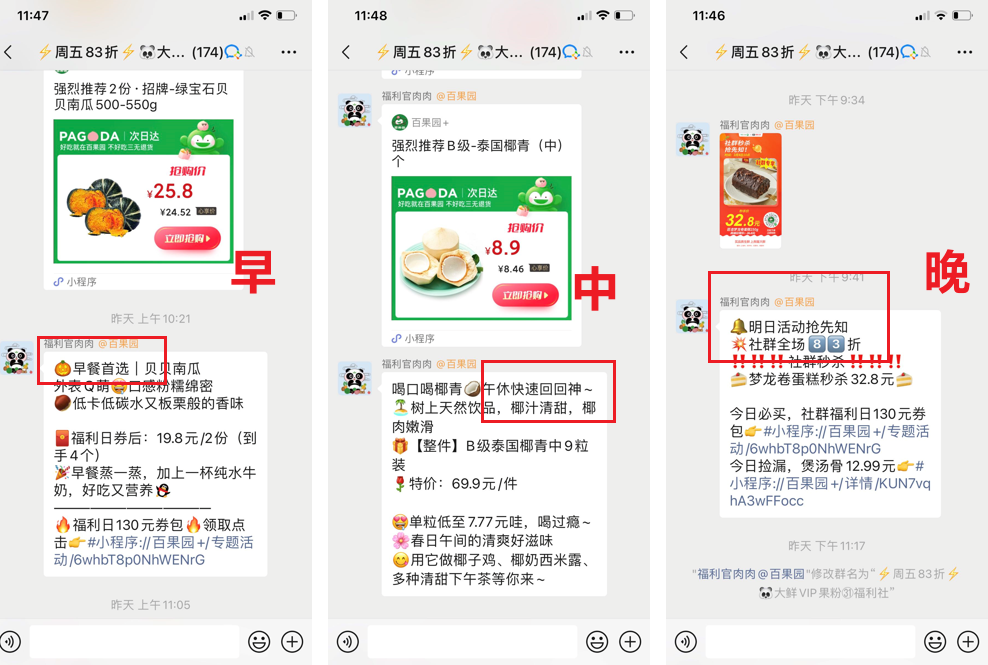 上午,推送晨间早报,门店到货通知、当日活动、爆品推荐;