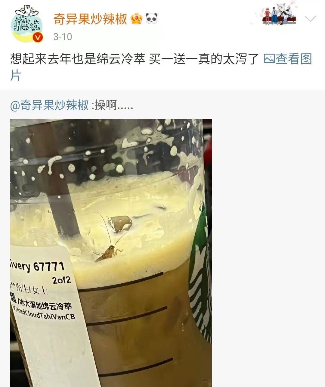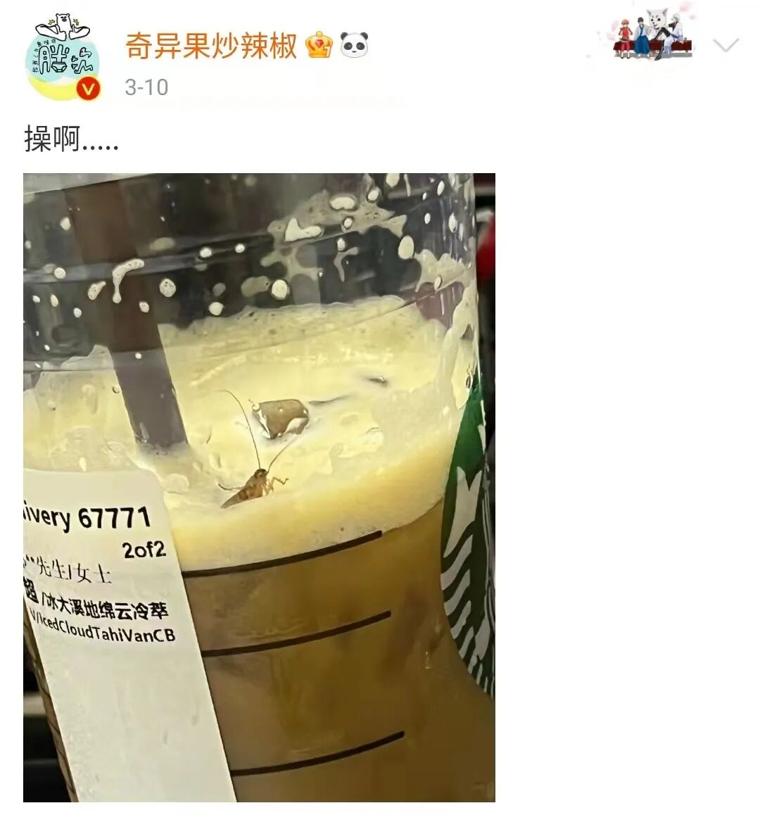 公交地铁全停运,一个极其讲究速度的城市突然慢了下来,还真有点不习惯。仿佛整个城市都在营造一种“慢生活”,特别适合喝杯咖啡,激活社畜人元气满满的一天。但这位网友@奇异果炒辣椒却没有因一杯星巴克元气满满,而是恶心满满。一杯星巴克饮品中,一只蟑螂幼仔正在悠闲的挥舞着触角,好不惬意。“操啊……”,一句优美的中国话显然不止是这位博主的心声,更是广大网友内心的呐喊!糟心的不是满杯星巴克里有个蟑螂,而是喝了半杯的星巴克里有个蟑螂!虽然有人看完连奶茶都喝不下去了,但这位博主却忙着调侃“买奶茶送宠物”。站在客观的角度来看,有这种吐槽很正常,毕竟自己是顾客,遇到了恶心的购物体验,难道不能吐槽吗?于是,压力来到了星巴克这边,本以为星巴克这回又又又摊上事儿了。毕竟前段时间驱赶民警、手写“阴阳文案”的怒火还积压在网友们的心中没有释放完。