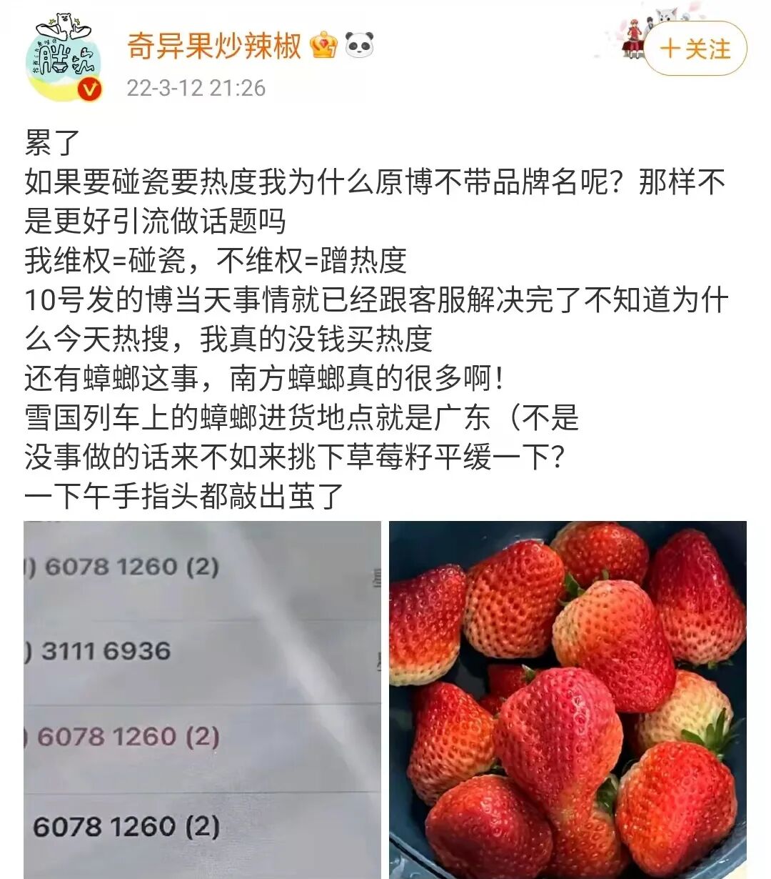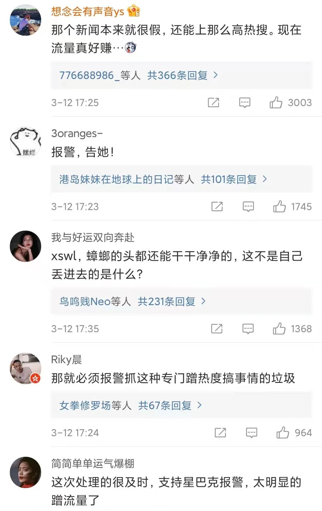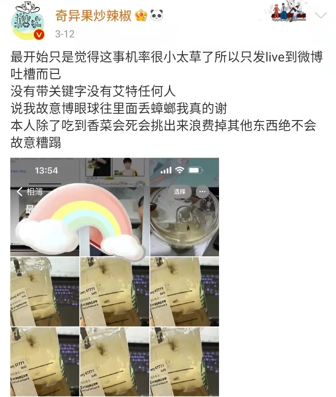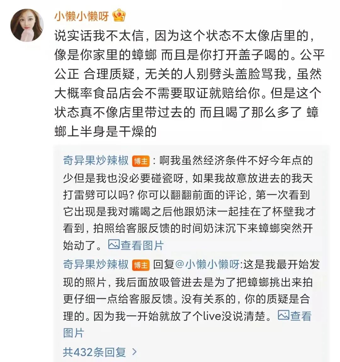 其二,为什么没有拍一下杯口?起码让大家看一下封口吧?完整封口只是戳了吸管,还是封口都撕掉了?理由是星巴克盖子大部分是透明的,蟑螂飘起来也在最上面 只要不是瞎子都看得见,不可能喝了半瓶才看见。博主自曝,同样是去年3月,同样是这家店,同样是这款产品,同样喝到了一只蟑螂!网友们的质疑点在于,这么小概率的事件,为什么你遇到了两次。更有意思的是,有网友扒出这位博主从2015年至今发表过十几次关于蟑螂的内容。字里行间的意思都是在暗示蟑螂是当事人放进去的,而且目的就是为了蹭流量。事件至此,已经从一个简单的网络吐槽演变成了一起网爆事件。网友们纷纷将舆论矛头指向博主,开始各种指责、谩骂,并贴上了“营销号”、“造谣者”的标签。但大家的结论十分一致:纷纷支持星巴克状告这位蹭流量的碰瓷者。但显然事态已经变成了支持博主派和支持星巴克派的舆论大battle。事情至此已经不仅仅是一杯含有蟑螂的星巴克的问题,而是更宏大意义上品牌、粉丝、网友三者之间的一场舆论争夺战以及以咖啡文化划分的阶层对立!这不仅超出了这位博主的想象范围,也超出了星巴克和网友们的想象范围。涉事博主被网爆、支持者被谩骂、星巴克被更多人讨厌、星巴克的粉丝被冠以“孝子”的头衔。虽然“蟑螂事件”背后真正的责任归属,我们暂且未知。不过,就本次事件的发酵进展来看,似乎成了一出彻头彻尾的舆论狗血剧。到目前为止,你很难去指摘发布蟑螂事件的博主,也很难去说摆出各种证据的星巴克有什么错。更难去指摘参与评判的网友们,毕竟大部分人都是怀揣着朴素的是非观与正义感来表达观点。不过在我看来,表面上看是一只蟑螂引发的“血案”,但本质上这是星巴克层出不穷的的食品安全问题、驱赶警察等负面舆论叠加的结果。这无形中让“蟑螂事件”有了更多的延展话题,也让舆论有更多的争议爆发点。而回到“蟑螂事件”本身,作为吃瓜群众,我们要做的不是急于站队当裁判,而是等待事实。所以,让子弹再飞一会儿!