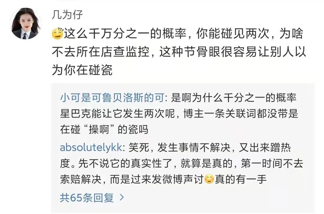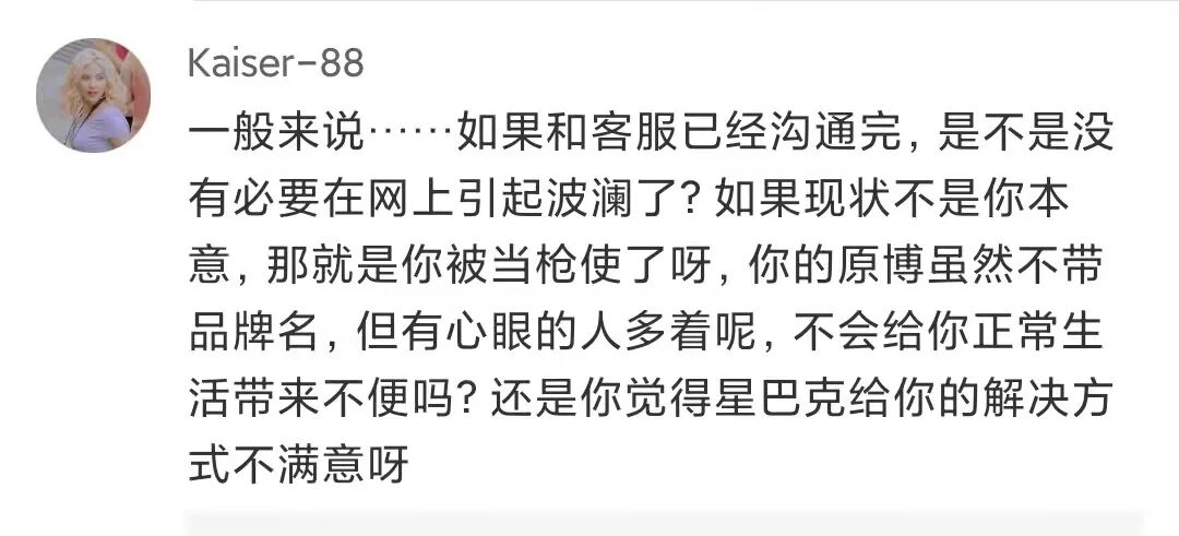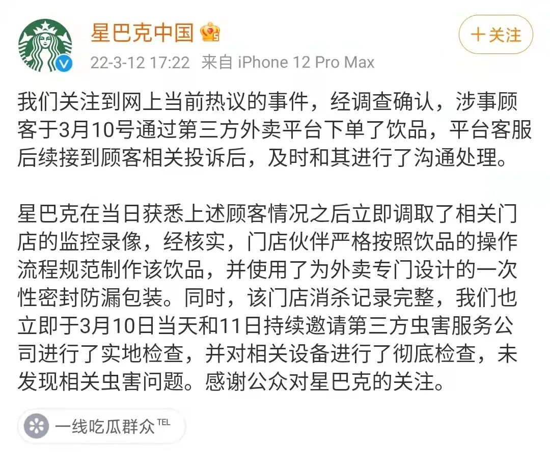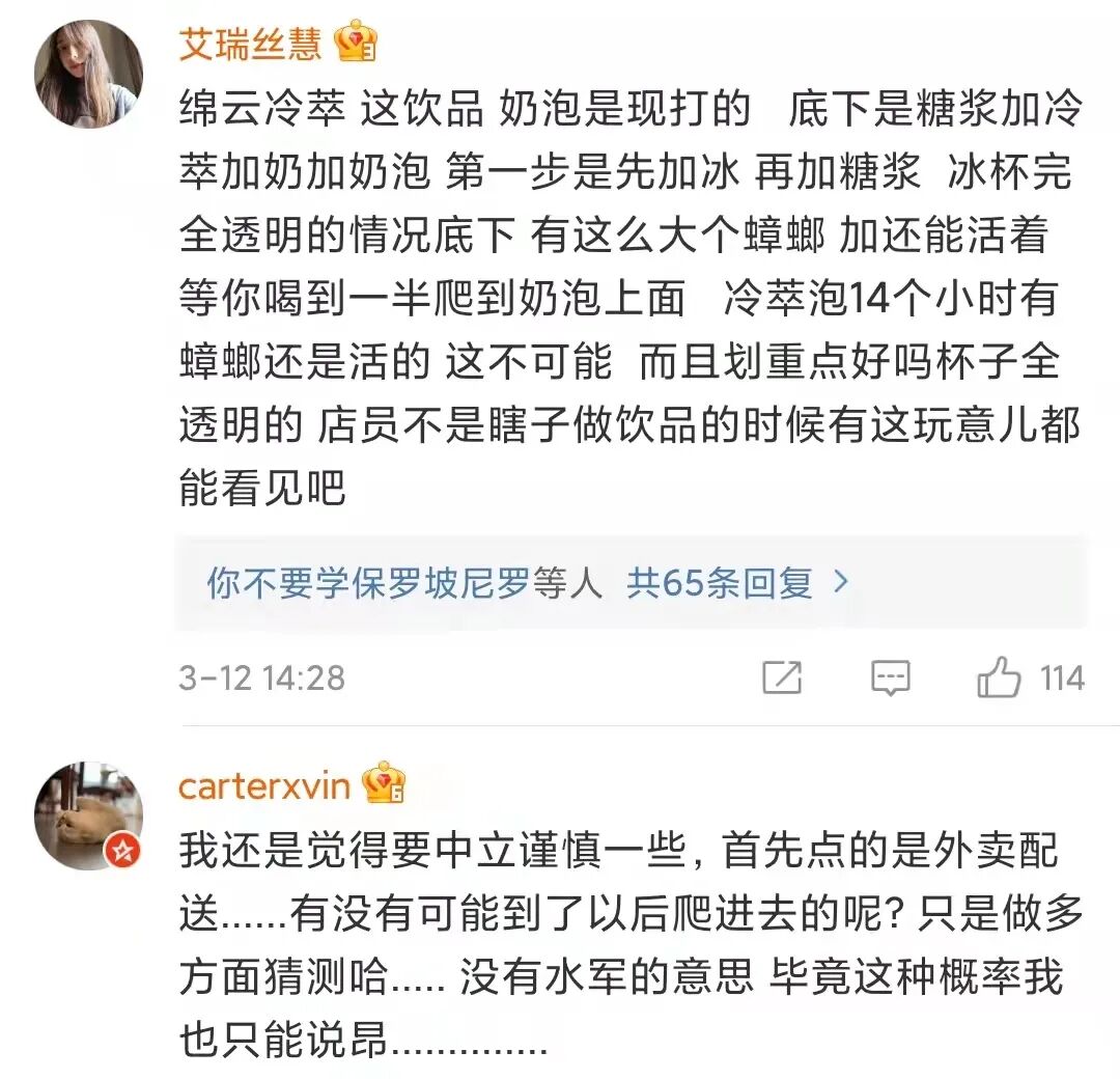 但这次,貌似又不是一个网友一锤子下来,星巴克毫无还手之力的“普通故事”。虽然事件发酵了两天,星巴克才去回应的操作确实槽点满满。但摆事实、讲证据的坚决态度让事件又走向了另外的舆论可能。1、我们看了监控录像,饮品制作流程规范,没任何问题;又是操作规范、又是第三方检测,而且这句话十分关键:“使用了专门为外卖设计的密封防漏包装”。从这份回应来看,星巴克这次几乎没有给大众留下任何可解读的空间。而且除了纸面官方回应,星巴克的员工纷纷自发表态,给出了“专业”解释:首先是在制作过程中,有那么大的异物出现,应该是会看得见的;其次这位博主点的这款饮品冷萃上面的绵云是牛奶加糖浆在搅拌机里搅30秒制成的,这个过程更不可能;绵云是最后淋在冷萃上的,如果真的是制作饮品时就在里面,应该早淹死了。看到如此态度坚决地星巴克,不少网友的态度也开始动摇了。这部分网友从逻辑推理的角度对博主提出了疑问,主要包括这么两点: