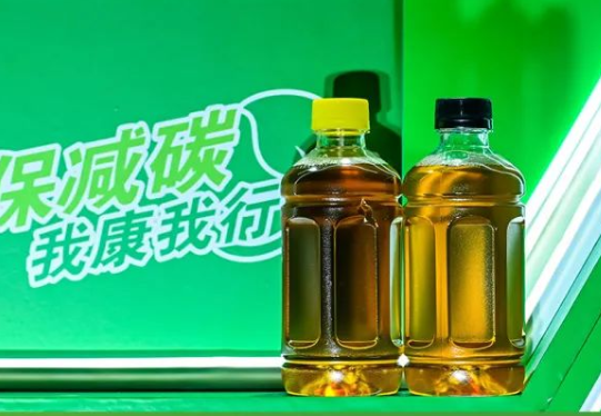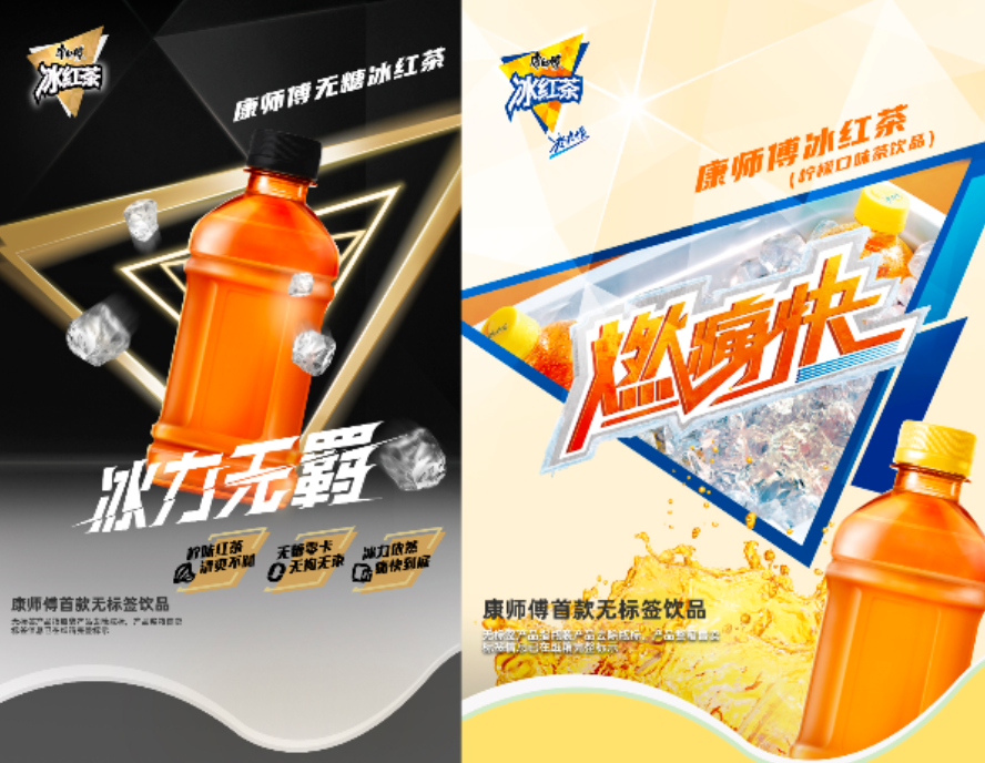 原来这是康师傅率先响应低碳环保战略,推出的首款无标签版的冰红茶。上面广告图看起来汁浓味美,现场图看起来是这个样子。