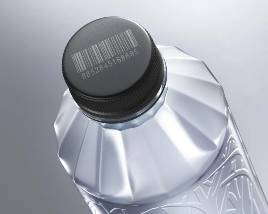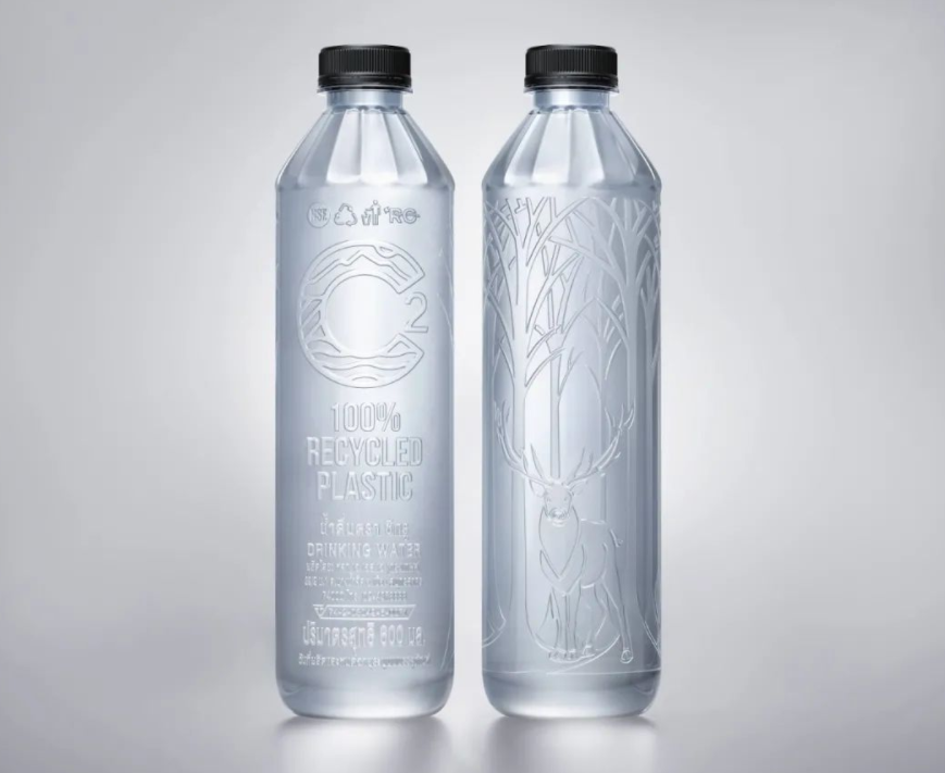 泰国C2饮用水,100%可回收PET制成,瓶身使用浮雕工艺,瓶盖上打印条码。