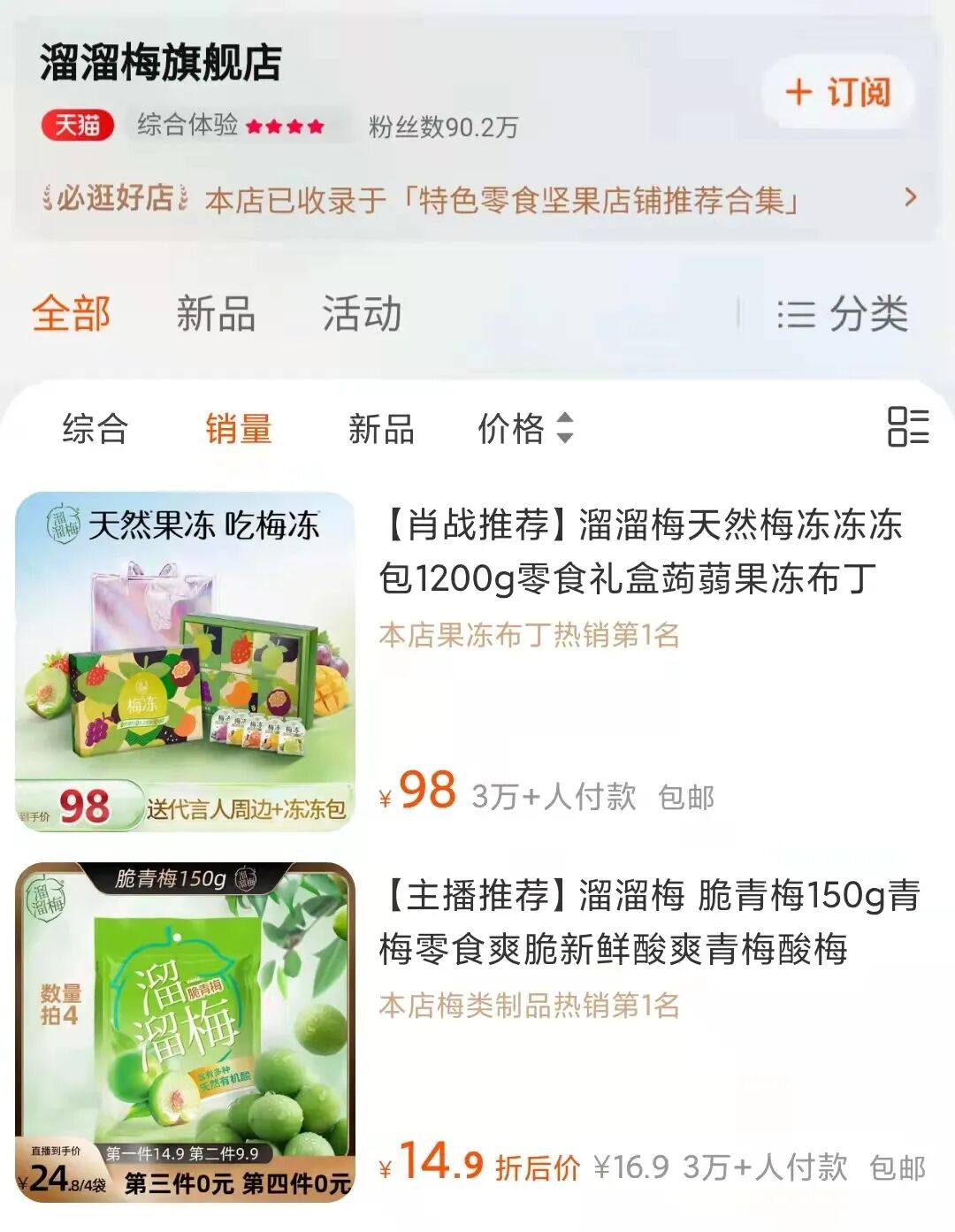 当然,粉丝不负众望,打开淘宝溜溜梅旗舰店,将产品按销量排列,确是打有【肖战推荐】的单链购买率最高,以这款单价为98元的梅冻礼盒为例,已经创下了300万的销售额,还不包括其他单链。这样看来,梅冻想要成为该品类的零脂代表还是潜力无穷的。纵观溜溜梅的品牌营销,除了代言人,线上线下还是很全面的。2021年在中国超市商品采购年会上,溜溜梅创始人杨帆发表了《创新体验 十倍成长 传统零售升级的溜溜梅解法》的主题演说,分享了溜溜梅在线下销售渠道设立“青梅体验站”的做法。体验站的设立,改变了消费者传统的购物习惯,有效延长了消费者的购物时间,进而提升了产品的购买转化率,增长了销售额。不仅梅冻,同品牌其他产品也得到了有效增长。从传统“芒种煮梅”这一习俗入手,将青梅与传承连接起来,讲解青梅相关的知识,并且与头部主流媒体央视网合作,联合抖音、快手、微博开展直播带货活动,实现了多渠道曝光。除了品牌营销,溜溜梅还注重对消费者的情感营销。2020年春节,发起了#自取青梅防晕车#的活动,联合自媒体平台,在多个城市提供了100万颗青梅为公益助力,这也带动了溜溜梅在春节的年货营销。由此可见,溜溜梅的营销之路不局限于促进购买这一目的,还深谙品牌底蕴的培养,使得青梅的文化属性与梅冻的健康属性破圈而出。在讲解青梅知识,注重消费者情感联结的赋能上,将短期的营销释放出了长期的效果。一个产品是否能成为同品类的超级单品需要时间的验证。除了产品本身的味道是第一要素外,营销与传播必不可少。溜溜梅从2006年创立至今,已走过了15年,或许这只是一小段旅程,但是只要积累好前期经验,深耕产品,做好梅类市场,有朝一日,成为梅冻界的“可口可乐”也未可知。
