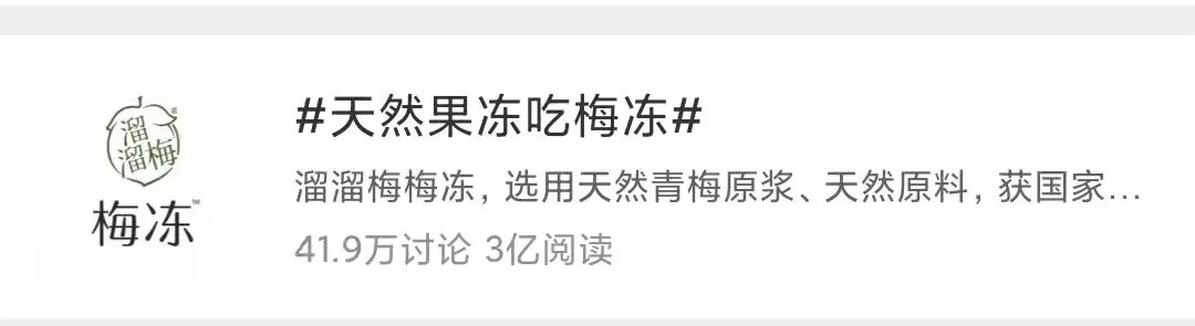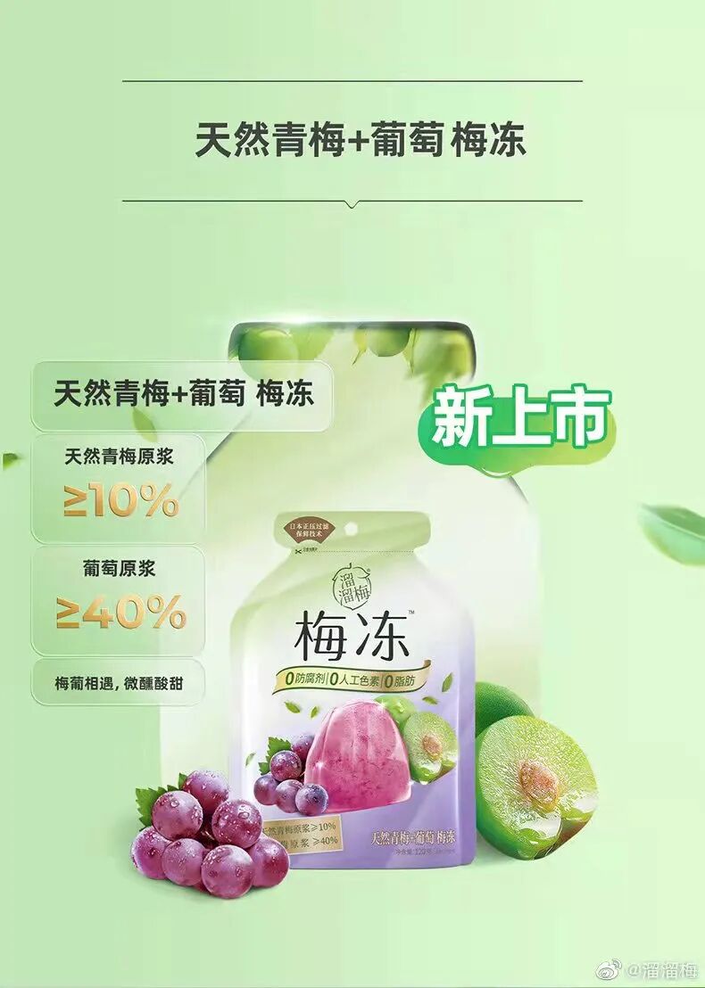 我记得肖战代言溜溜梅是去年12月的事了啊,怎么这个时候又上热搜了呢?哦,原来是旗下品牌"梅冻"出了新口味,天然青梅+葡萄梅冻上线。“天然青梅原浆≥10%,葡萄原浆≥40%,0防腐剂,0人工色素,0脂肪”是这款梅冻主打的卖点,甚至还号称要颠覆传统果冻。果冻大家都吃过,童年零食的扛把子品牌,但是好像随着长大,越来越远去了。究其原因,无非是传统果冻添加剂、人工色素多,随着Z世代健康意识和消费意识的觉醒,进而被定义为了不健康食品。而溜溜梅的这款梅冻,不仅和正常果冻一样的口感,还号称0防腐剂,0人工色素,0脂肪,使得它与传统果冻区别开来。特别是”零脂肪“这个卖点的提炼,不仅拉开了它与同类产品的差异化,还使消费者眼前一新,受到了很多购买者的喜欢。上市以来,已完成了热销2.2亿的成绩,并且未来还在不断更新。大家也知道,这些年,“亚健康”问题被广泛提及,大家健康意识逐渐觉醒,关注身体健康的命题越来越“热”。前有谈“糖”色变,而现在又有谈“脂肪”色变,大家唯恐摄入一点不健康的东西。零食要吃低卡的,比如卫龙的魔芋爽,巧遇心的蒟蒻果冻;
