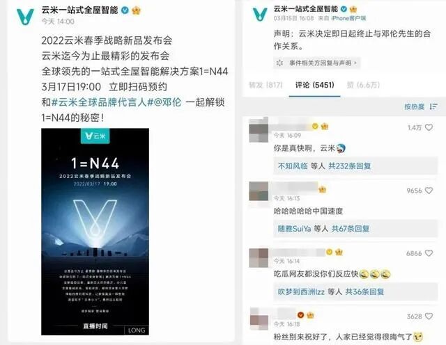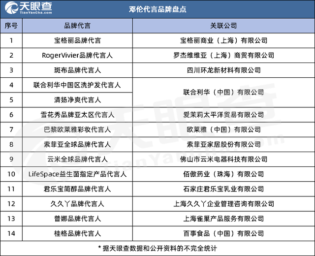 有消息称,邓伦还和发小们共同创立了火锅品牌“火社火锅”。邓伦目前有十多个代言,奢侈品牌宝格丽,洗护品牌雪花秀、欧莱雅、清扬等,还有食品品牌桂格、君乐宝等。这次,解约速度最快的品牌是云米, 距离官宣邓伦为代言人仅过去2个小时,被网友戏称“两小时代言人”。