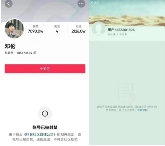 明星翻车后,接下来的剧情,大概是帐号被封,主演作品下架,各大综艺剪辑,再者就是各大品牌解约官宣。目前,邓伦个人微博、抖音账号、邓伦工作室微博账号均被封,微博最狠,只给了一个道歉机会。