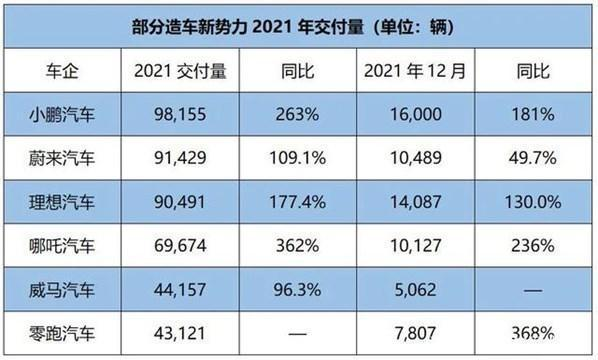 蔚来全年累计交付91429辆,同比增长109.1%;理想汽车2021年的总交付90491辆汽车,同比增长177.4%。