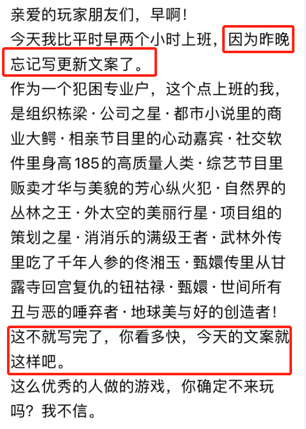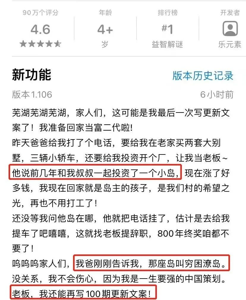 好家伙,神TM“穷困潦岛”,又被诡计多端的策划小哥给套路到了。仔细想想,这不就是个段子式的更新文案嘛。前半段剧情夸张引人入胜,后半段出现反转,令人忍俊不禁。