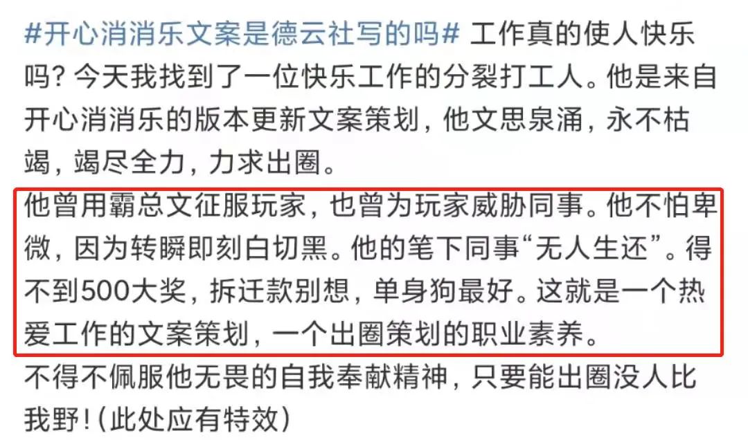 顺着文案中提到的话题#更新文案只服开心消消乐#摸过去,发现消消乐的策划小哥还真是个有趣的灵魂。写起更新文案来,那是信手拈来、一套又一套的,真让人怀疑是德云社的“在逃写手”。