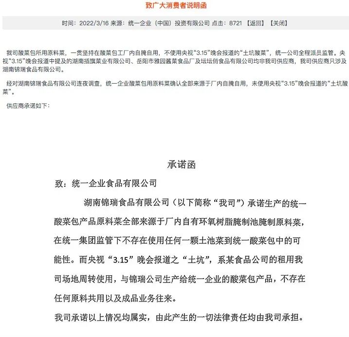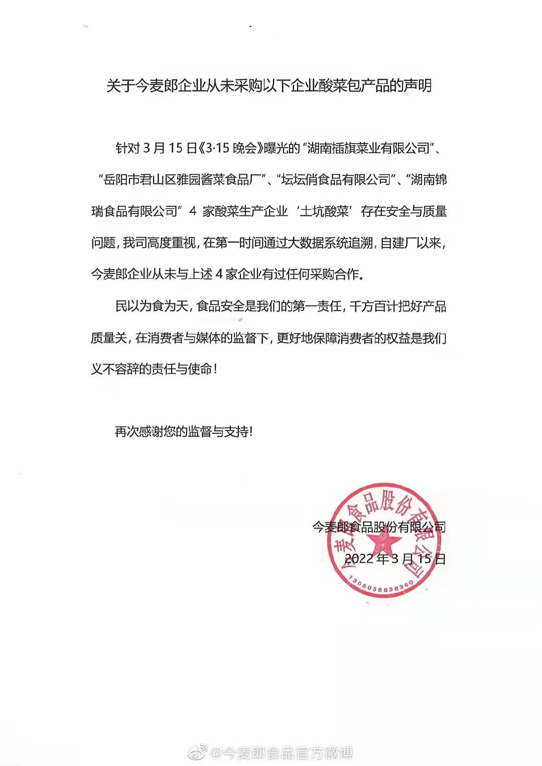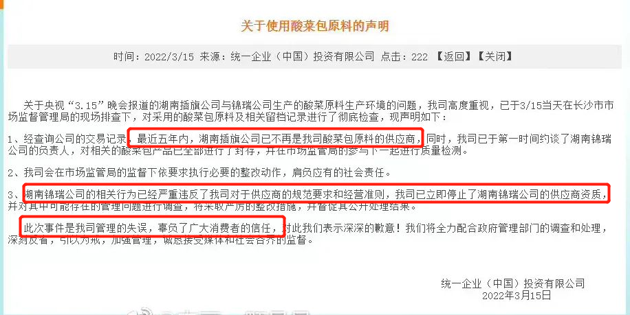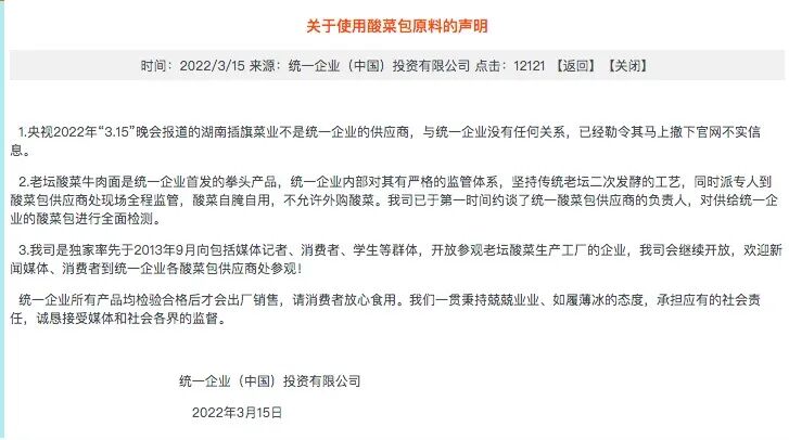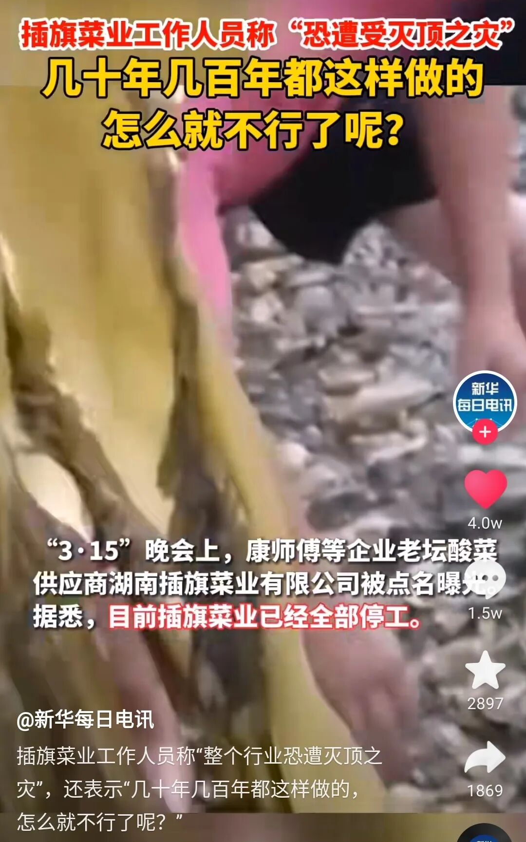 这句话用在这几天闹的沸沸扬扬的315“老坛酸菜事件”出奇的恰当。只怪我当时太年轻,没有理解广告词中通假字用法的深意。那老酸酸菜的翻车则让90后那些深夜吃泡面前咽过的口水都yue了出来。那些一包老坛酸菜配着一根双汇火腿肠的日子终究是喂了狗了。谁能想到,颠覆整个泡面界不是那些如日中天、动辄估值几十亿dollar的新消费。一个“小作坊”凭借一己之力竟将统一、康师傅、肯德基等国内外行业巨头纷纷拖下水!再大的品牌终究抵不过吃过老坛酸菜的朋友们一阵阵“干呕”的声讨。迫于压力,京东、天猫等电商平台以及不少线下大型超市已经下架了相关产品。但工作人员“几十年几百年都这样做的怎么就不行了?”的回应更让人气愤。虽说每年的315都是一场道歉集锦,但今年的火力却尤其的集中,终究是酸菜承担了所有。火力太猛,以至于一位名叫@康师傅老坛酸菜牛肉面的网友都被误伤。第一份:插旗是我的供应商,已经取消合作了,我错了,辜负了大家!第二份:真的取消合作了,下架回收产品,大家监督我吧!首先,可能是为了“掩耳盗铃式”的少挨骂,鸡贼的选择了在官网、而不是微博发声明。第一份:插旗5年前就不是我的供应商了,是锦瑞(另一曝光土坑酸菜企业)做错了,我们管理失误。第二份:插旗和我没任何关系,是它碰瓷我;我的老坛酸菜很牛,工艺一流、大家随便参观,放心吃!于是,统一删除了第一份声明,只保留了第二份“我很优秀”和第三份“我没问题”的声明。虽然结果没毛病,但整个一波三折的声明给人一种“小人得志”的感觉!相比康师傅立正挨打的态度,统一是赢了产品,输了格调。没想到这一波一线品牌崩盘了,二线品牌却把腰杆挺直了!先说一下太二酸菜鱼,作为以“酸菜”立身的品牌,为了自证清白,不仅发布了纸质声明。还甩出了一份《太二酸菜安全报告》,并在评论区大喊:行得端 坐得正!自建厂以来,今麦郎从未与被曝光企业有过任何采购合作。这显然是吸取了统一“5年没和插旗合作” 的教训,“建厂以来都没合作”的操作确实秀到我了!之前媒体报道称白象将插旗菜业列为原材料供应重点企业。正式回应的短短35个字,字里行间都充满了傲娇的硬气!面对这些,当年那波野性消费鸿星尔克的劲头又被网友拿了出来。每一年的315晚会就像一面照妖镜,把诸多妖怪邪魔照个透亮:我们不苛责每个品牌都能纯粹到把社会价值拉满。只希望在商业的本业里做到问心无愧。希望315的致歉不仅是一种态度,更是行动。