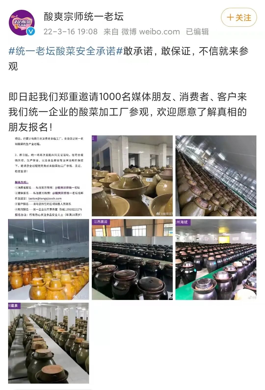 “即日起我们郑重邀请1000名媒体朋友、消费者、客户来我们统一企业的酸菜加工厂参观,欢迎愿意了解真相的朋友报名!”