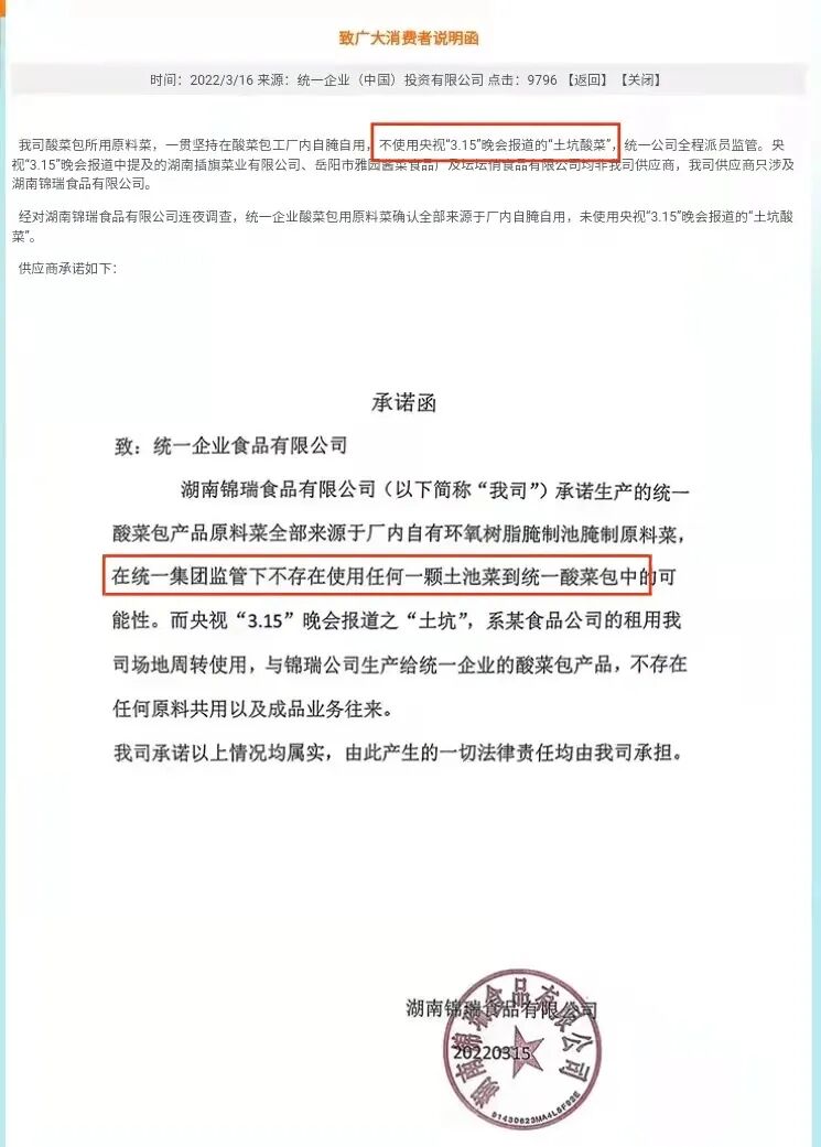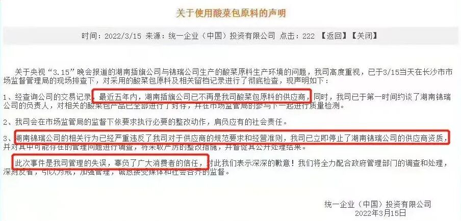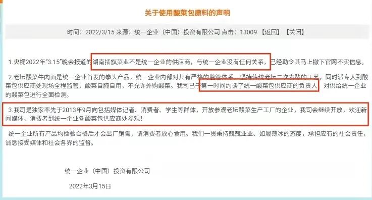 此次统一也被卷入这场“酸菜风波”,刚开始颇有点病急乱投医之感,着急忙慌发了第一份声明。