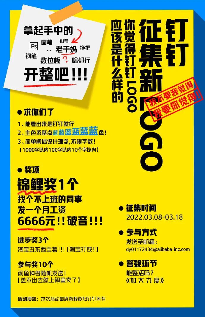 近日,钉钉发布一张新海报,向全网征集新头像,并设置了丰厚的6666奖金,掀起了一场设计比拼热潮。