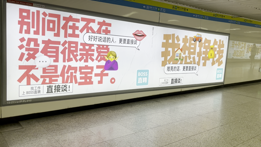 不仅如此,BOSS招聘还在北京、长沙等多地地铁站投放了一组引人注目的海报文案,道出广大求职者的真实心声。这组海报以应届毕业生、宝妈、资深职场人士、00后的身份口吻,生动诠释了他们对找工作的态度。打破了招聘方占据主导地位的传统偏见,让「直接谈」落实到每一位或平凡或特别的求职者身上,契合招聘是双向选择的主流就业趋势。在BOSS直聘与昂扬LIVE联合举办的春招活动中,也能看到BOSS直聘将宣传的主语移接在用户身上,更加贴近年轻人的就业观。BOSS直聘还以「我,工作,生活——我是工作的主语」为主题举办展览,探讨工作与生活的平衡关系。从找工作完成了在工作中寻找生活意义的高阶过渡,拔高了BOSS直聘的品牌调性。曾几何时,铺天盖地的「找工作,我要跟老板谈」洗脑广告植入用户脑海中挥之不去,让BOSS直聘从此走进人们的视野。然而,BOSS直聘成名于BOSS,被诟病也于BOSS。在过去的营销传播中,BOSS直聘仅仅停留在「跟老板谈」的口号,没有深度触及招聘的真实现状,比如跟什么老板谈、怎么谈、谈什么......空头支票般的承诺,让BOSS直聘陷入了“虚假宣传”的漩涡。现在BOSS直聘卸下了“老板”的标签,在用户和招聘者之间强调“直接谈”的工具属性,更着重提升双方沟通的质量和效率,优化了BOSS直聘既往的隐藏弊端。与此同时,单一枯燥的招聘变得可趣味搞怪,可煽情走心,也可发人深省,开拓了BOSS直聘在营销语言表达上更多的可能性。当BOSS直聘不再痴迷洗脑广告,BOSS直聘的魅力才能更让人上头。