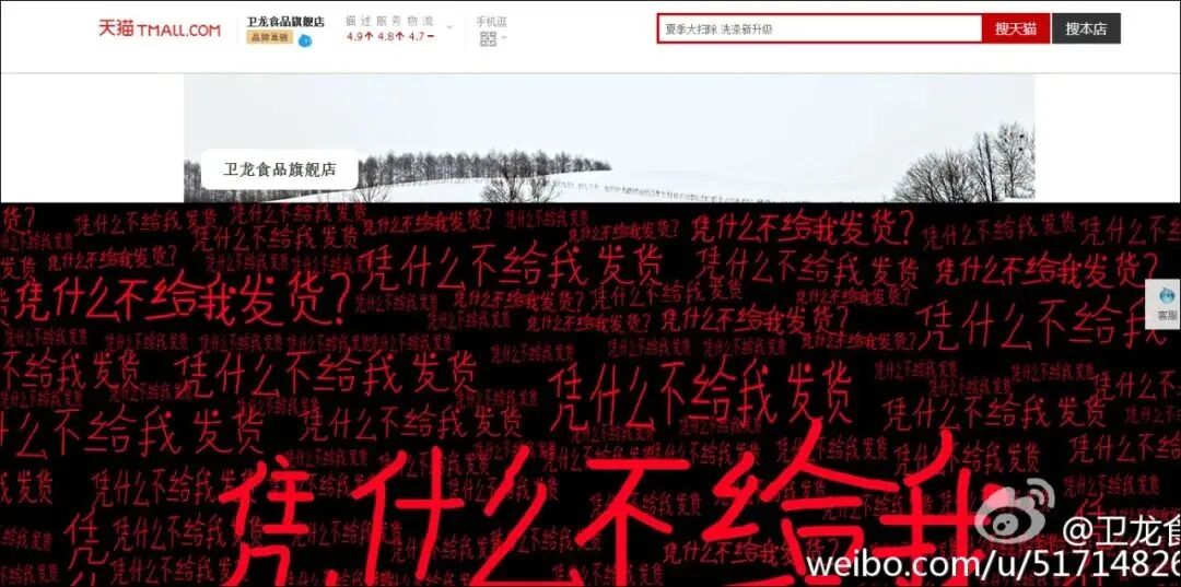 2016年6月,卫龙天猫旗舰店被黑,门店首页被满屏的“凭什么不给我发货”刷占满,好不容易修复后,又再次被“我要给你点颜色看看”等漫画表情包刷屏。