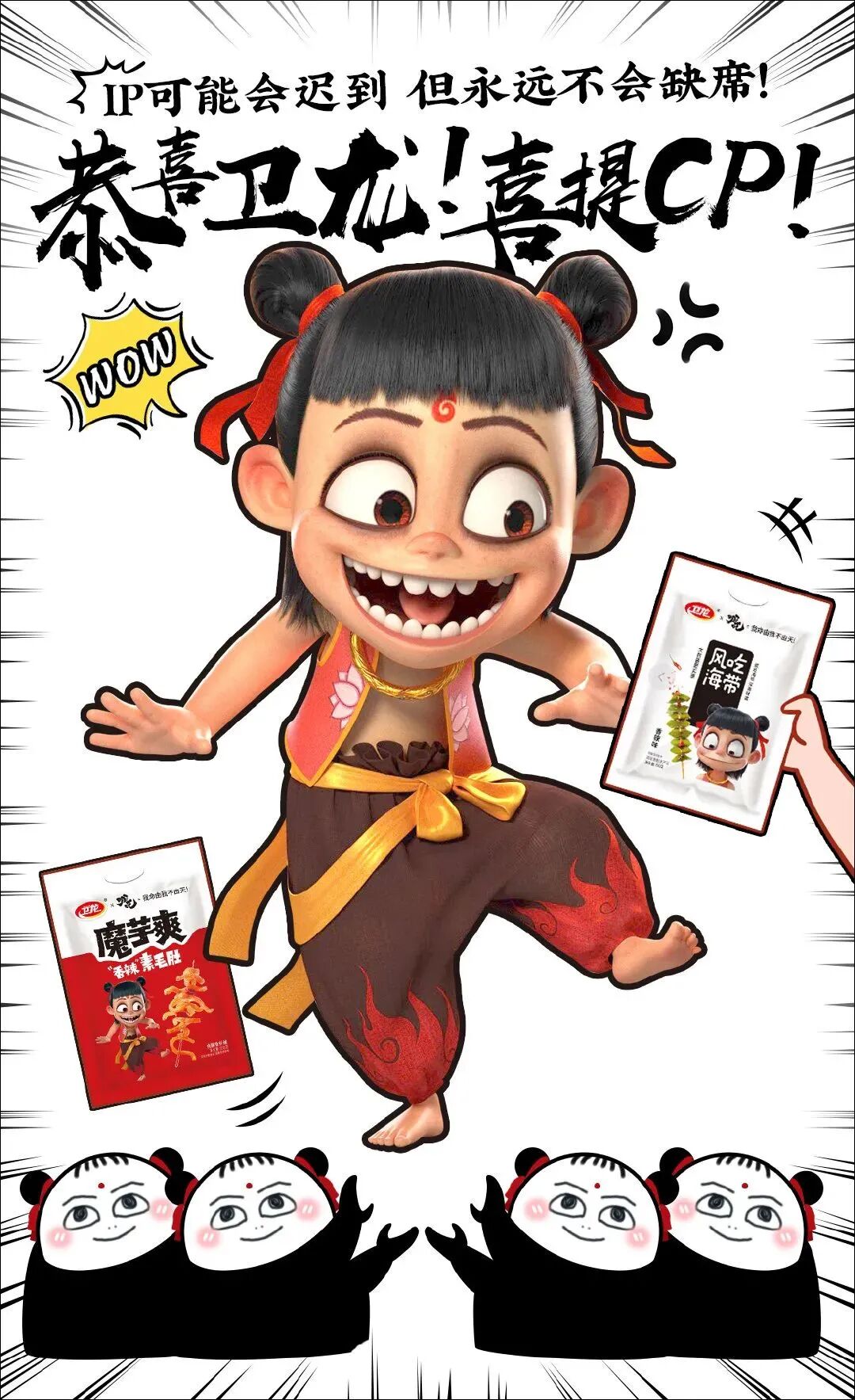 卫龙与国漫IP哪吒联名推出联动产品魔芋爽、风吃海带时曾一度刷爆网络,一个是自带“火”的少年,一个是充满“辣”的美味,两者的碰撞为大家上演一出“火辣”CP。