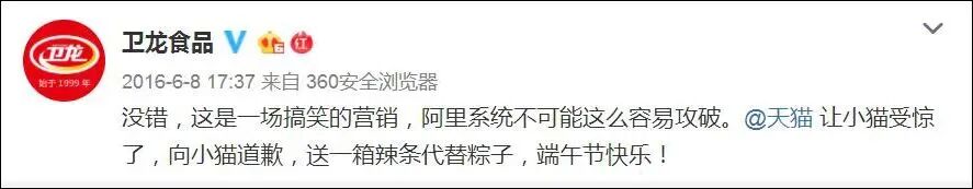 而这,不过是卫龙为之后6.18购物节造势的营销包装而已。眼见事情愈演愈烈,卫龙官方赶忙声明:这是一场搞笑的营销。如此极致的自黑想来很难被超越,被黑当天卫龙店铺的访问量也达到了高潮,68万人的流量超过天猫超市成为行业第一名。