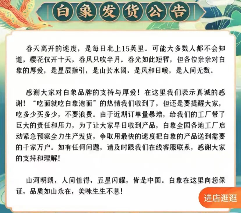 而在白象的官方旗舰店下,白象也发出公告明确表示,“由于近期订单量暴增,给我们的工厂带来了巨大的责任和压力,为了让大家早日收到产品,白象全国各地工厂启动紧急预案全力生产发货。