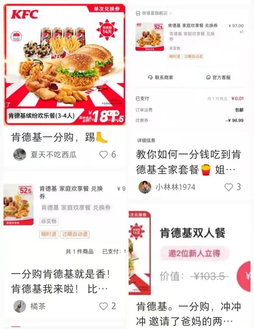 如#肯德基一分钱#的微博话题阅读量超过6600万,在小红书、豆瓣等平台上也有很多人主动晒出一分购的攻略等。