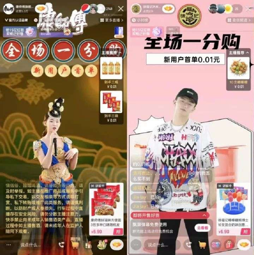 和其他平台的电商带货不同,“社会摇”是这些全场一分购直播间的主旋律。