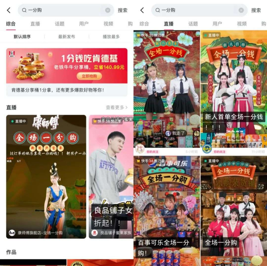进入到快手电商频道就可以看到,“一分购”占据了众多前排推荐。尤其是在热门时间段,搜索一分购,直播间可达40多个。