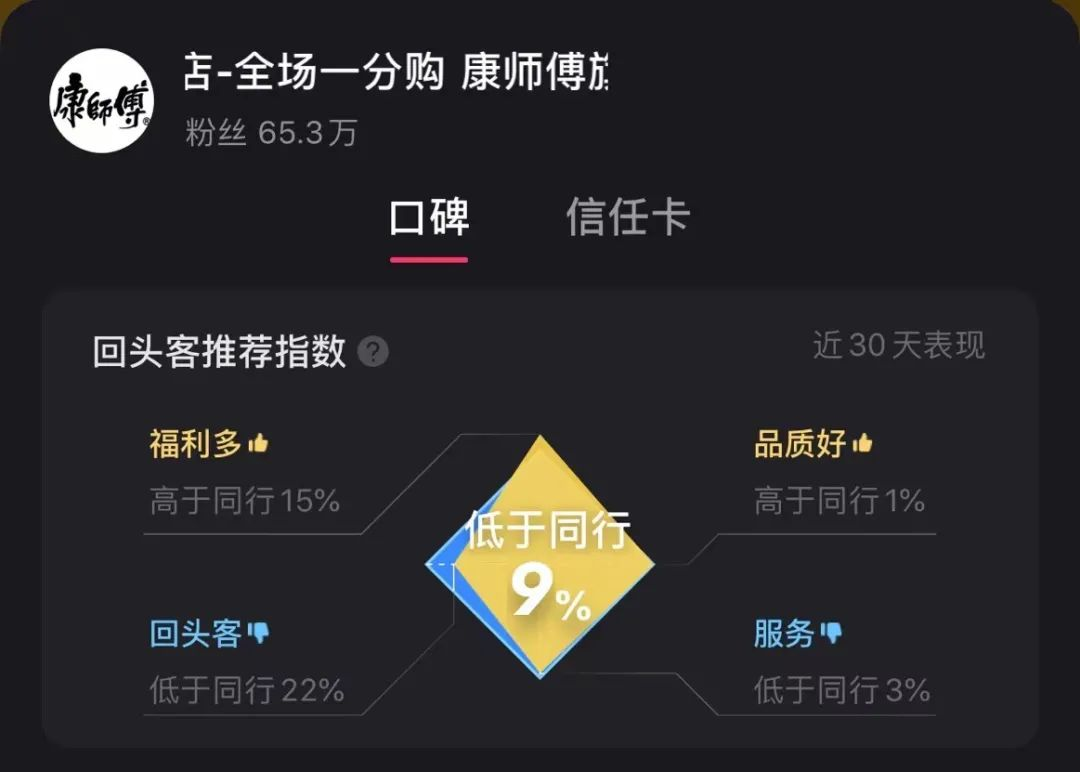 以康师傅直播间为例,尽管直播数据排名前列,但口碑比同行低9%,回头客更是低了22%。