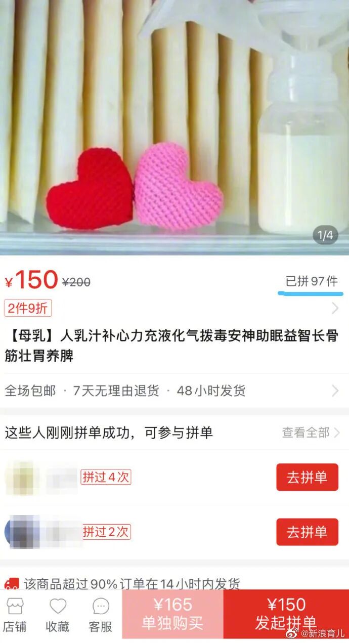 曾有人把母乳比喻成是“买不来”的,是小婴儿出生后填饱肚子最佳“口粮”。售卖“母乳”的是一家名叫“遇见是美”的店铺,而且“母乳”是店铺唯一上架商品。店家拍着胸脯表示,库存真实,母乳冷藏可保存3天,冷冻可保存3个月,宝宝喝不完吸出来马上冷冻保存。对于卖家十分关心的安全问题,店家在话术上也早有准备:“宝妈生产全面体检健康,核酸检测正常,有献血和脐带血捐献。”3月28日的时候,店铺交易显示母乳已售卖97袋,单价为100毫升150元。但今天我在拼多多已经搜索不到该店铺,看来拼多多“事后诸葛亮”的速度还挺快。02