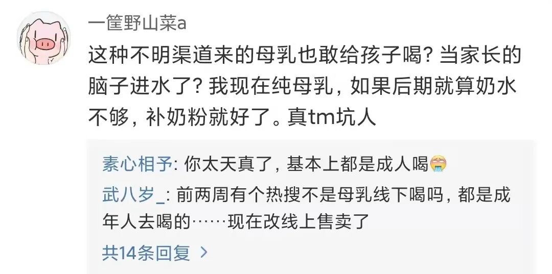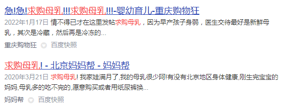 虽说中国人不骗中国人,但我心里还是憋了一万个“为什么”——我十分好奇那97袋母乳都被谁买去了?谁会买来路不明的母乳给孩子喝?有需求就有市场。其实这个问题由来已久,早年间,在58同城、赶集网、闲鱼和一些育婴网站上都有母乳交易行为。现在在百度搜索“求购母乳”,还可以发现有母乳需求的母亲不在少数。心理能不能接受的问题也可以放一边不谈,但购买的母乳携带乙肝等病毒的风险不能不考虑。实际上我国很早就建立了“母乳库”,所以真的没必要冒这个风险。03