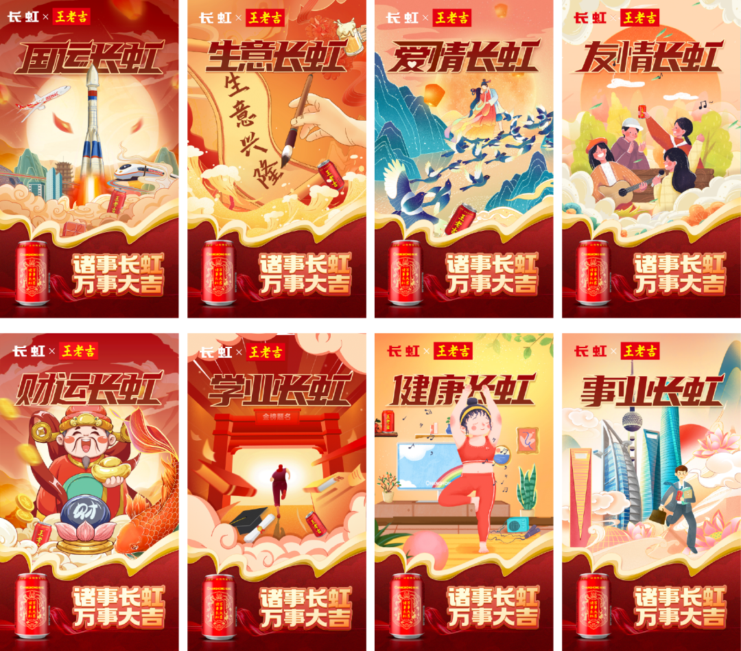 两大品牌双方跨界意在覆盖到生活的方方面面,从多个方面诠释“虹”运,推出“国运长虹、生意长虹、爱情长虹、友情长虹、财运长虹、学业长虹、健康长虹、事业长虹”八大主题海报,让“虹”运为各个场景带来祝愿。