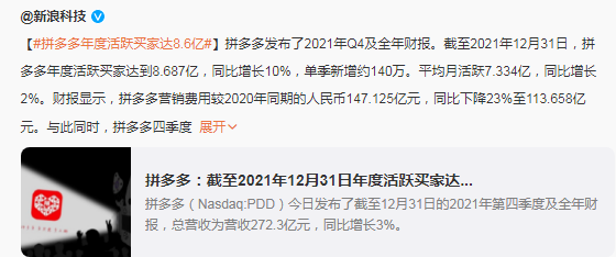根据拼多多年报显示,截至2021年12月31日,拼多多年度活跃买家达到8亿,同比增长10%。平均月活跃7亿,同比增长2%。