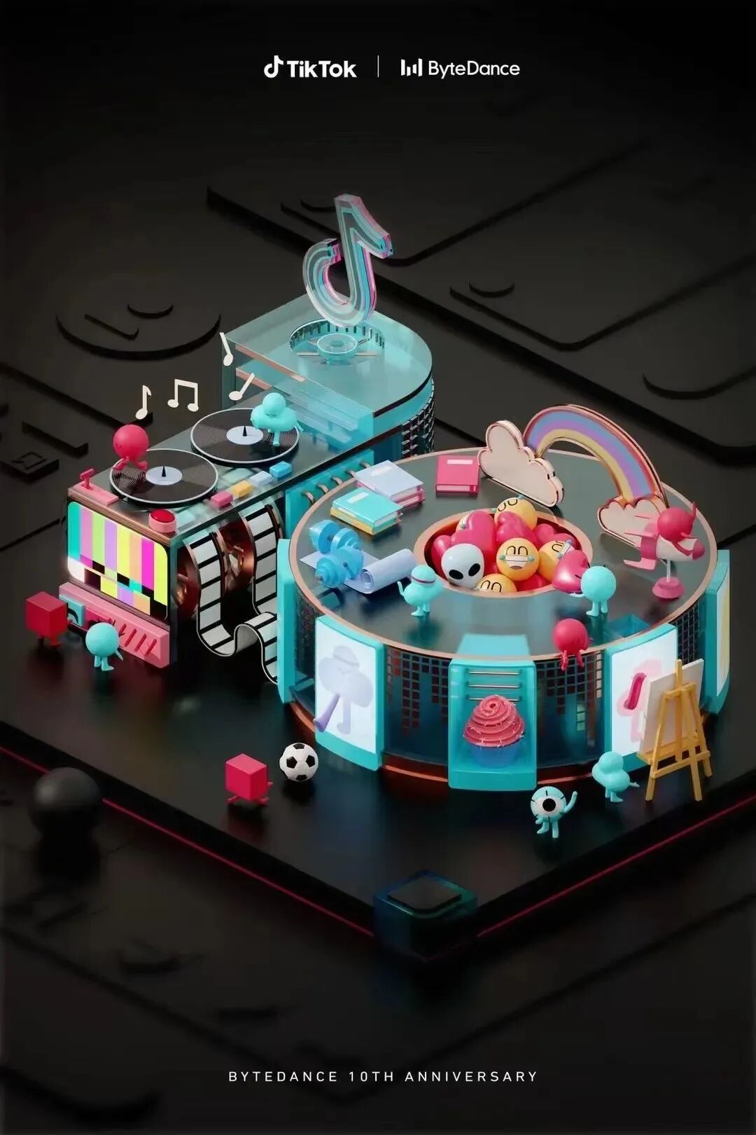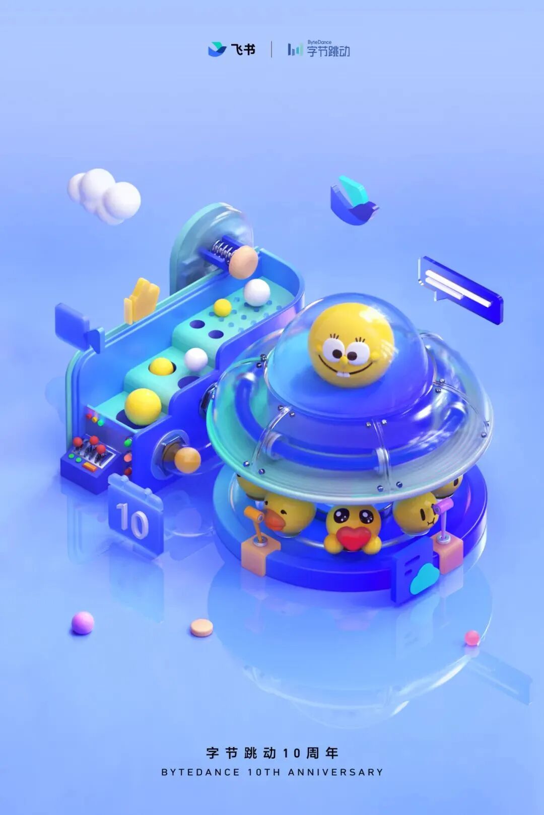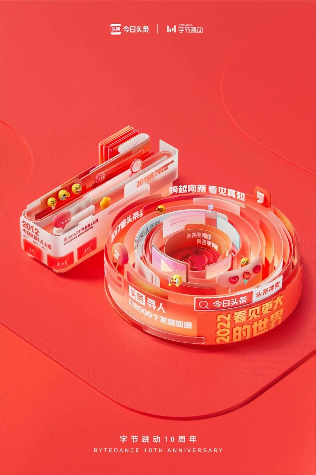 不仅在十周年短片中字节跳动展现了旗下30多个产品带给用户生活的改变,同时,字节跳动还联合旗下今日头条、抖音、TikTok、开言英语、轻颜相机......30多款产品共同发布10周年庆祝海报。