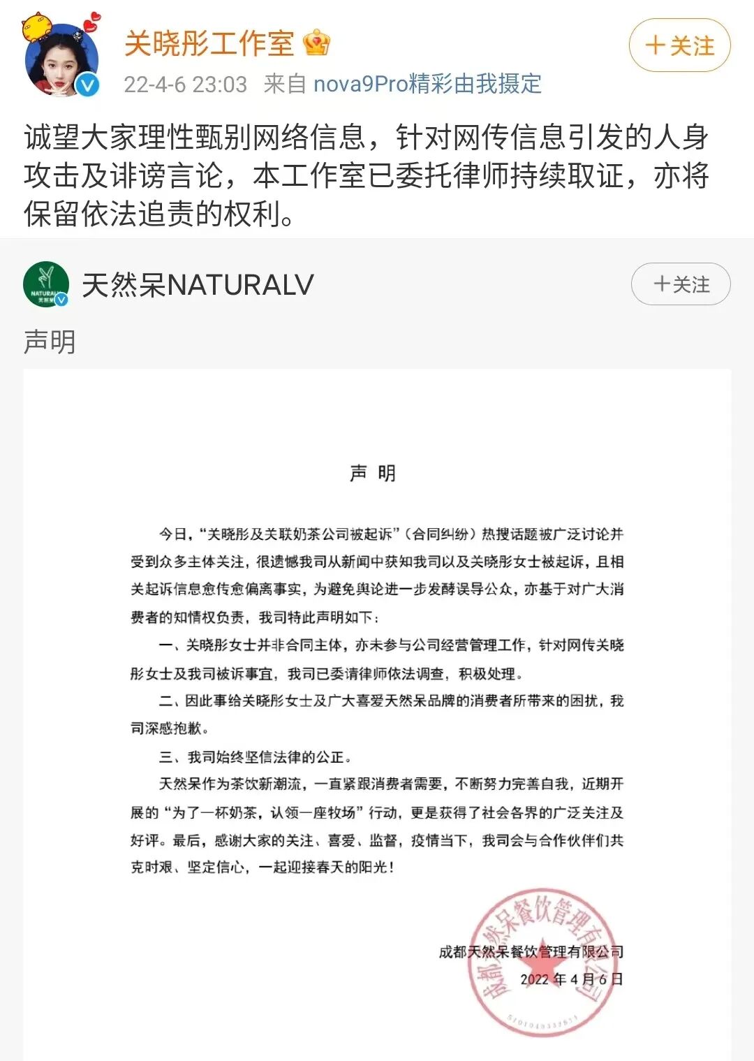 随后,天然呆官方在回应中都极力撇清和关晓彤的关系;关晓彤本人也拿起了法律的武器要状告“造谣者”。