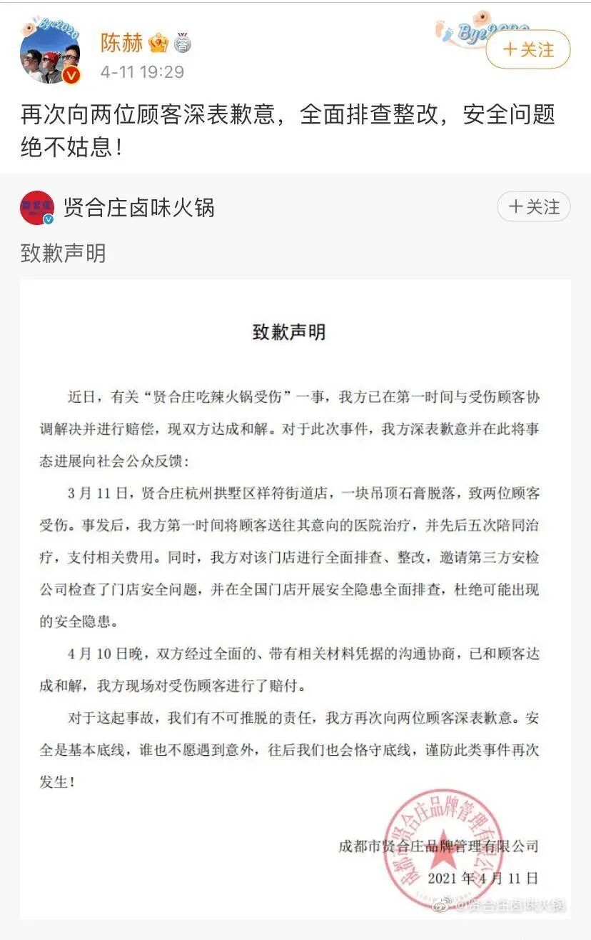 去年的几乎同一时间,明星陈赫的火锅店因为“天花板坠落”烫伤顾客引发舆论关注。