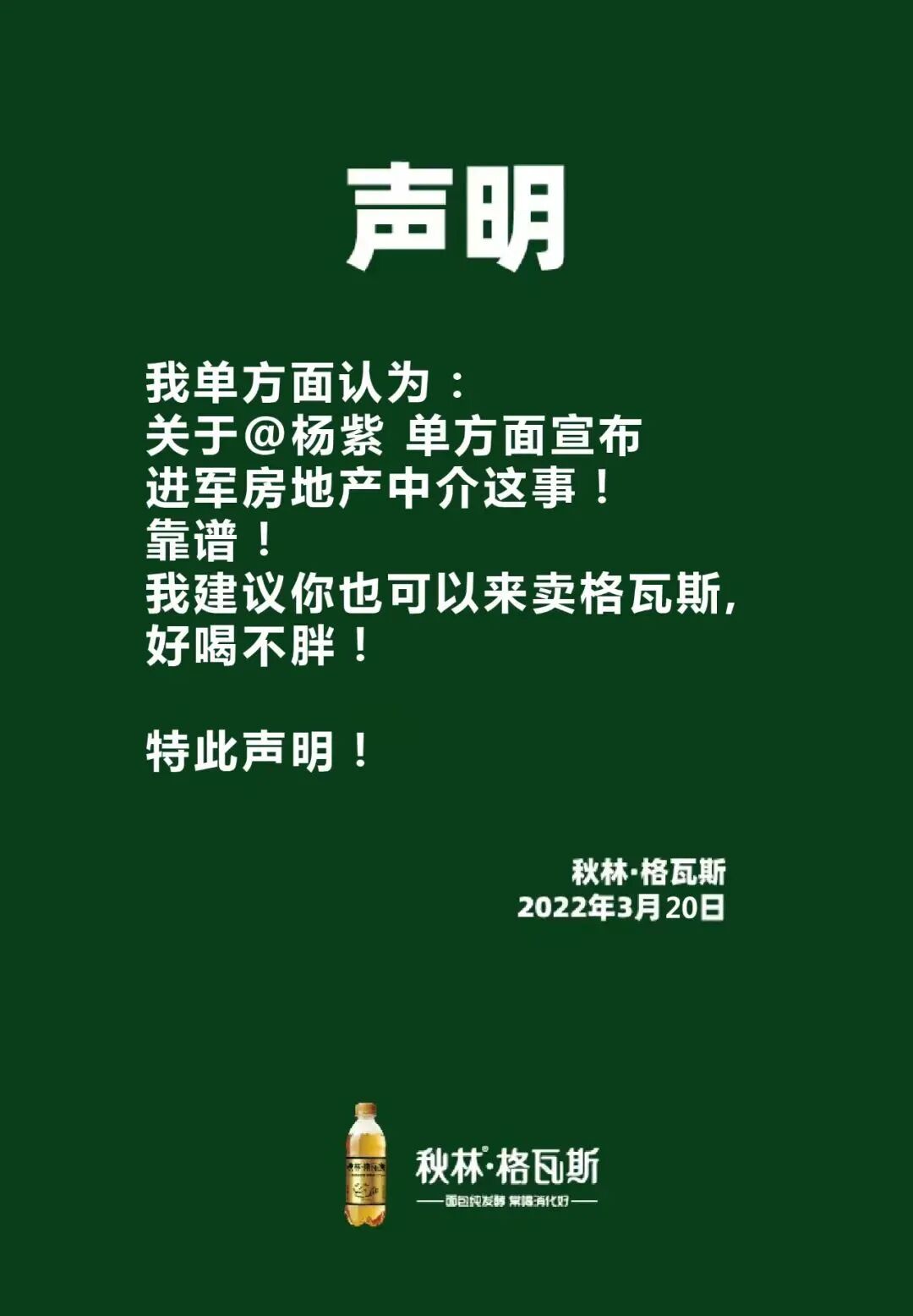 互联网时代,流量热度来得也快消散得也快。品牌也需积极捕捉流量变化的风向标。品牌的“单方面声明体”引得不少网红、明星的相继模仿,其中就包括杨紫。搭乘《余生,请多指教》的热度,演员杨紫发表“单方面声明体”微博——单方面宣布正式加入房产中介行业,品牌快速回应:建议可以来卖格瓦斯,好喝不胖。借势明星的热度,秋林格瓦斯可谓是又抓住了一波流量,获得了持续的流量与关注度。