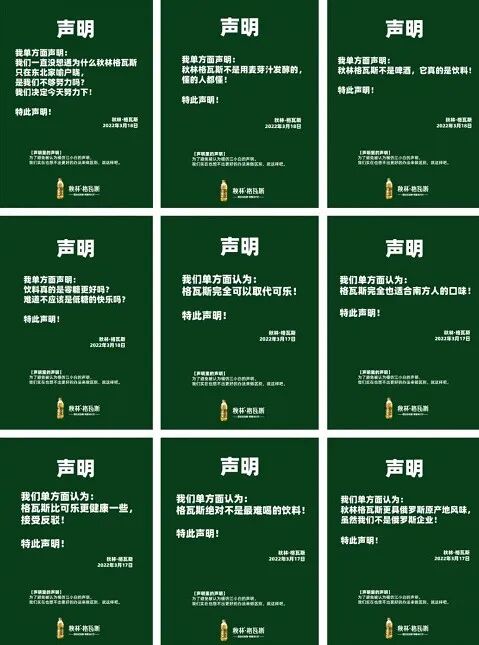声明,简而言之就是让用户理解品牌所作的事件,达到广而告知的效果。秋林格尔瓦斯的18份声明,一环扣一环,同样的模板,不一样的发声,循序渐进的给大众解惑秋林格瓦斯是一款怎样的饮料:比可乐更健康;营养价值比可乐更高……”直指产品卖点,最后直接表明态度:完全可以取代可乐。