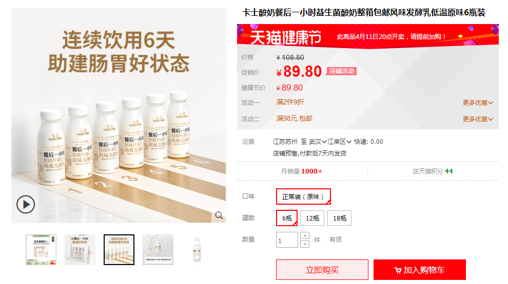根据天猫旗舰店的官方价格显示,6瓶250克的酸奶售价就达到了89.8元。相比较国民品牌蒙牛、伊利旗下的酸奶,这个价格绝对是处于高端定位了。