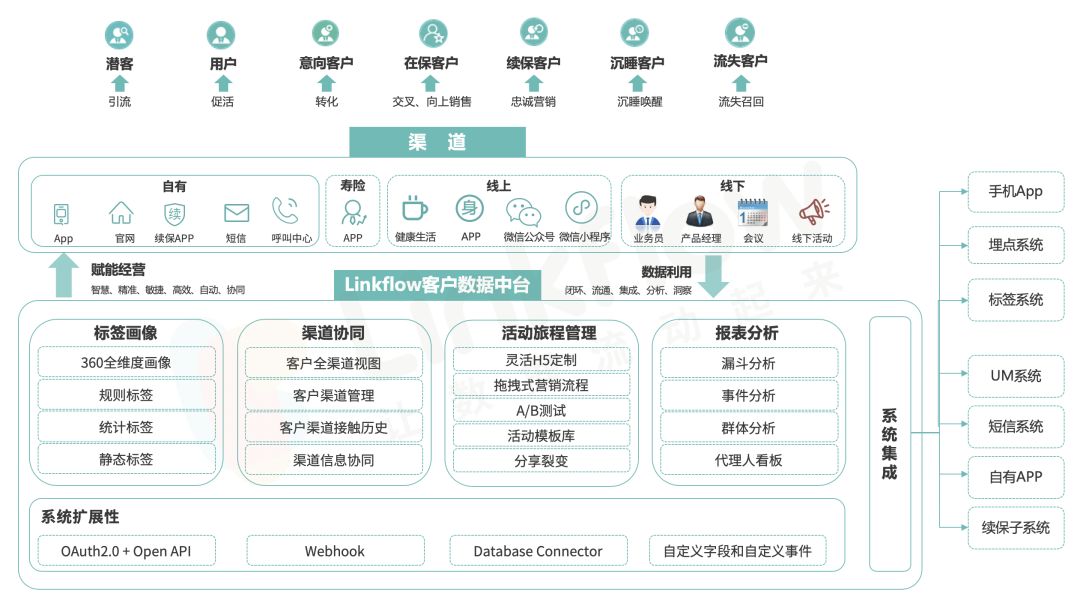 Linkflow客户数据中台为该企业提供千万级用户的数字化营销能力,实现保险客户智能展客场景。