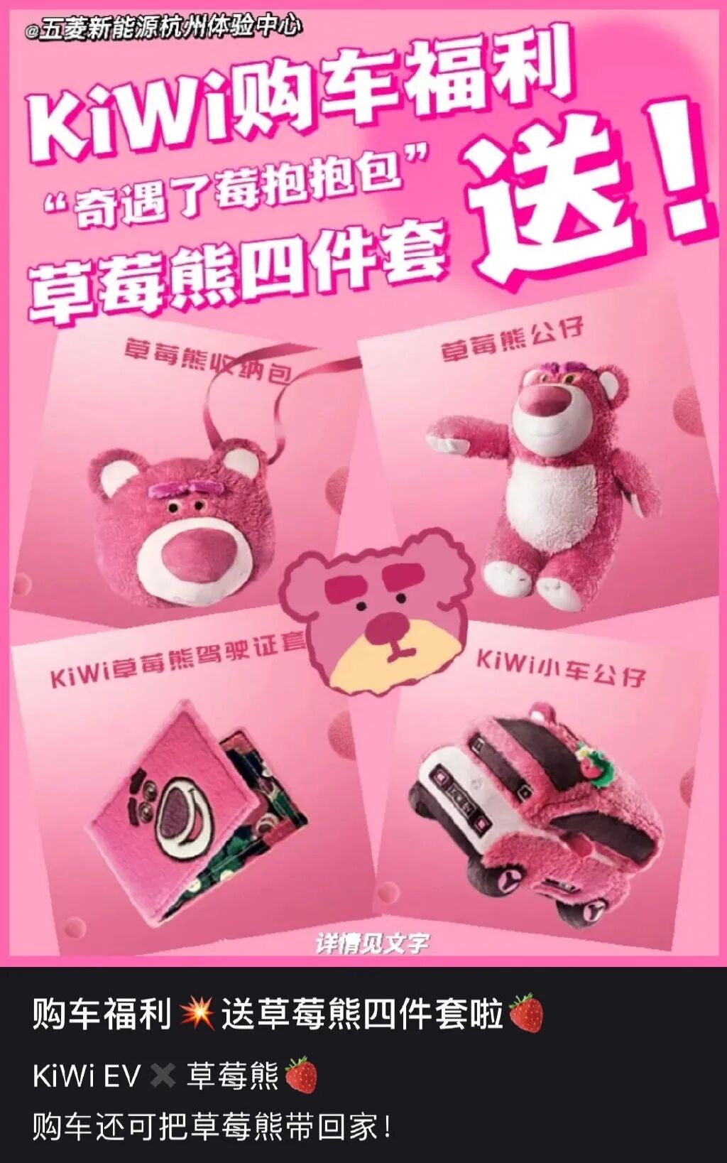 疫情初期口罩短缺,五菱马上改造生产线生产口罩、捐赠物资,获得大众拍手称赞。地摊经济蔚然成风,五菱迅速推出豪华地摊车,成为诸多年轻人追捧的摆摊神器。螺蛳粉火遍全国,五菱跨界上线螺蛳粉界,在端午节的营销节点,还与盒马联合推出了螺蛳粉粽子。高举“人们需要什么,五菱就造什么”的大旗,五菱汽车成了社交话题的焦点、热搜上的常客,被贴上了“人民的五菱”的标签,跟成了“年轻人的五菱”。最近,五菱与迪士尼一大IP《玩具总动员3》梦幻联动,旗下主打时尚、前卫的微型电动车KiWi EV与迪士尼的草莓熊跨界合作,带来了一次少女心满满的联名营销。草莓熊IP是迪士尼和皮克斯动合作动画《玩具总动员3》中的反派角色。它看上去是粉红色、毛茸茸的,闻起来是香香甜甜的草莓味,憨厚可爱的外表下,却有一颗“病娇”的心,强烈的反差萌深受观众喜爱。硬核的五菱车+粉嫩的草莓熊,同样自带反差萌,让这次联名一出街就吸睛无数。五菱这款KiWi EV联名款草莓熊车的外观设计,在汽车品类可以说是史无前例。整车车身被双色毛绒材质进行包覆,车侧装饰着3D立体的草莓熊立体造型,车顶有熊耳朵,车尾还有小熊尾巴,简直把一辆车打造成了一个大型毛绒玩具,让消费者看见车身,就自然联想到同玩具熊温暖的怀抱。KiWi EV草莓熊版内饰设计,也全盘采用了毛绒材质,座椅、方向盘,甚至后视镜都是毛茸茸的,不止i粉色系的小姐姐,猛男看了怕不是也会心动。与此同时,五菱还推出同款周边,融合汽车和草莓熊元素,随处可见的毛绒质感以及粉红色系元素,呆萌又可爱,拿捏女性目标群体对“萌物”的个性追求。不仅外表上足够吸睛,五菱还将这款毛绒草莓熊,打造成了一次话题营销。首先,草莓熊车自带网红属性的造型,一上街引发了路人自发围观打卡的热情。五菱抓住女性消费者喜爱分享的特质,一传十、十传百,让毛茸茸的草莓熊车在社交网络上掀起讨论热潮,拿捏了“萌经济”的流量密码。而面对全身毛茸茸的车子,一些网友开始疑惑,这要是下雨天,不就芭比Q了吗?对此,五菱官方账号KiWi小助手迅速响应:KiWi自带反向充电功能,可以手动吹干。不仅在互动中,将品牌话题声量再度推高,还反向输出了一波产品优势。网友的疑惑从侧面也反映出五菱这台粉红熊车的营销噱头大过实用功能。五菱也深知这一点,于是同期推出了熊总同款皮肤的防水版本电动汽车。“并不实用”毛绒款草莓熊车表面上是满足一部分年轻人对个性收藏的需求,实则更深层面上,为同款联名新车积攒了话题度和热度。不得不说,五菱这招“声东击西”的玩法确实高。实际上,草莓熊联名款,并不是通用五菱首次与迪士尼IP合作。此前,五菱NanoEV和迪士尼《疯狂动物城》联名,推出Judy、Nick两个版本的限定款车型。这对迪士尼著名的狐兔CP,为五菱收割了不少CP粉喜爱。更早之前,五菱还和网红新茶饮喜茶来了一次小清新的灵感碰撞,让“血液里流淌着奶茶的”都市女性,注意到了这款“可盐可甜”的车型。此外,五菱还与年轻一代高度聚集的文化社区B站、时尚杂志《ELLA》、潮流文化平台YOHO、任天堂Gameboy......都玩起了梦幻联动,蹭IP之多到了“令人发指”的地步。蹭IP联名,除了让品牌收获热度之外,更有意思的是,让消费者的注意力不自觉就被吸引到这个“营销节的清流”、“有点不一样”的五菱。一次次看似“不务正业”的营销动作,将品牌的一举一动成倍放大,为下一次的营销动作积累更大的声量和消费者基础,形成良性循环。蹭热度、眼球只是手段,五菱纷繁复杂的跨界联名,最重要的是为品牌开辟了一条画风与众不同的年轻化营销新道路。2020年五菱推出了电动汽车,“改造热”迅速在小红书、微博等社交平台上蔓延开来。从前有购物指南、家装指南、电视指南......而五菱创造了车装指南。顺应社交平台“改造热”,五菱官方推出《车贴指南》,鼓励车主根据自己的爱好改造车身,响应Z时代的追求个性、自我的需求。联名草莓熊车的这款宝骏KIWI EV,更是直接由品牌帮你改造,消费者只需提出自己的个性化需求,就可以定制到带有个人标签的专属小车。