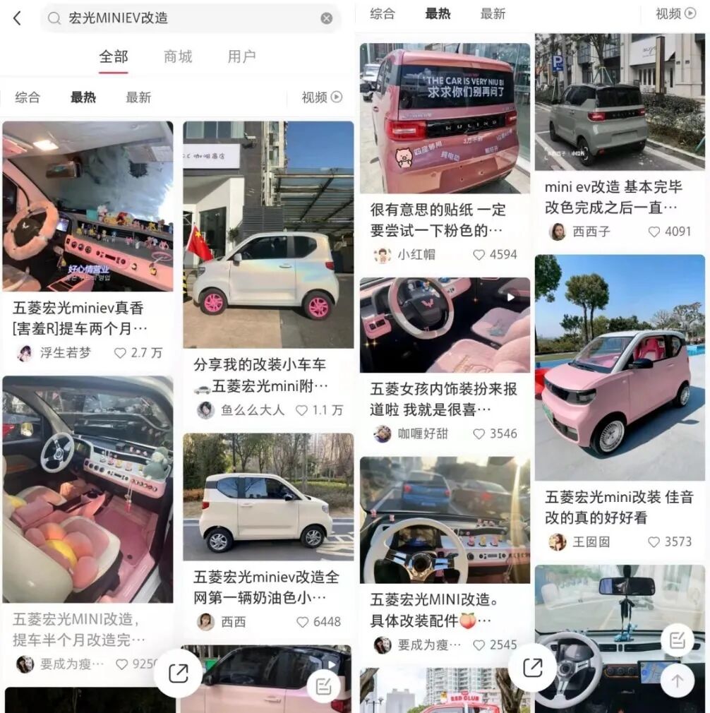 在小红书搜索宏光MINIEV,扑面而来都是车主改装案例。满屏粉红气息,让秋名山神车,摇身一变成为了女孩们的大型硬核潮玩。根据五菱官方数据显示,宏光MINIEV的90后用户占比达到72%,女性车主占比超过60%。这也奠定了五菱“越来越萌”的营销路线。迎合女性消费者的审美取向,五菱MINI EV推出马卡龙特别系列,白桃粉、柠檬黄、牛油果绿,三个网红色号,狙击女性消费者的少女心。