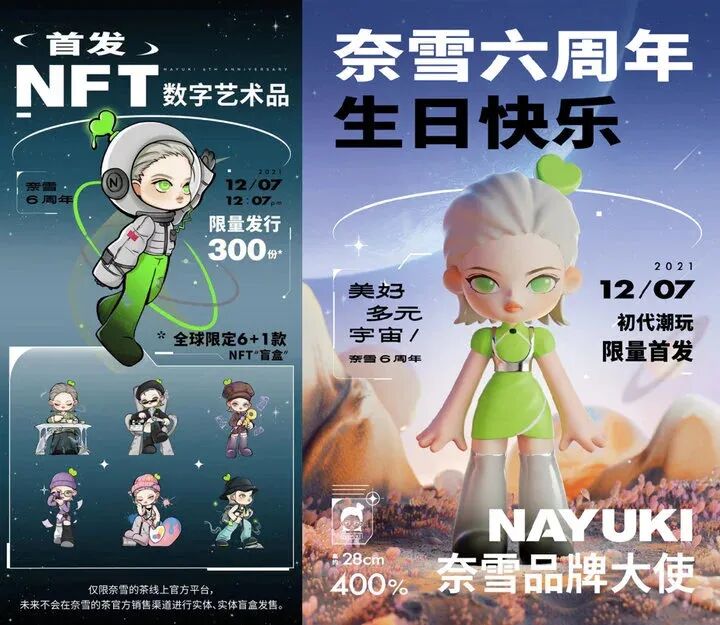 除此之外,品牌方们也纷纷入局NFT以达到营销效果。像去年年底,奈雪的茶在六周年庆发布官方IP-奈雪女孩,并推出了NFT盲盒艺术品,售价和实物潮玩一样都是59元/个。